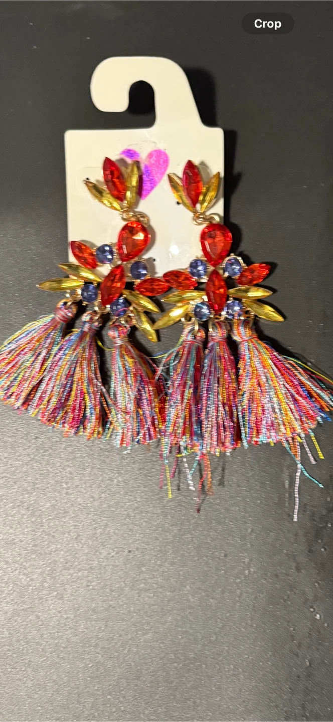 These are a pair of colorful tassel earrings! They have red, gold, and blue gems at the top with a rainbow of colors in the tassels