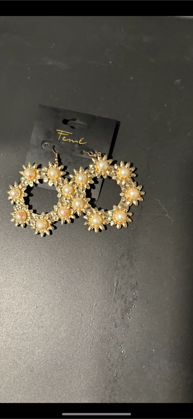 Selling a pair of gold-tone hoop earrings from Femé. These earrings have a unique design with pearl-like accents. They are in good condition and ready to add a touch of elegance to your outfit!