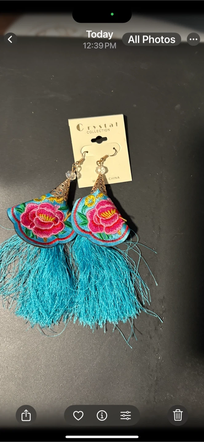 These are a pair of Crystal Collection earrings! They are new with the tag still attached. They feature a floral design with a turquoise tassel. Perfect for adding a pop of color to your outfit!