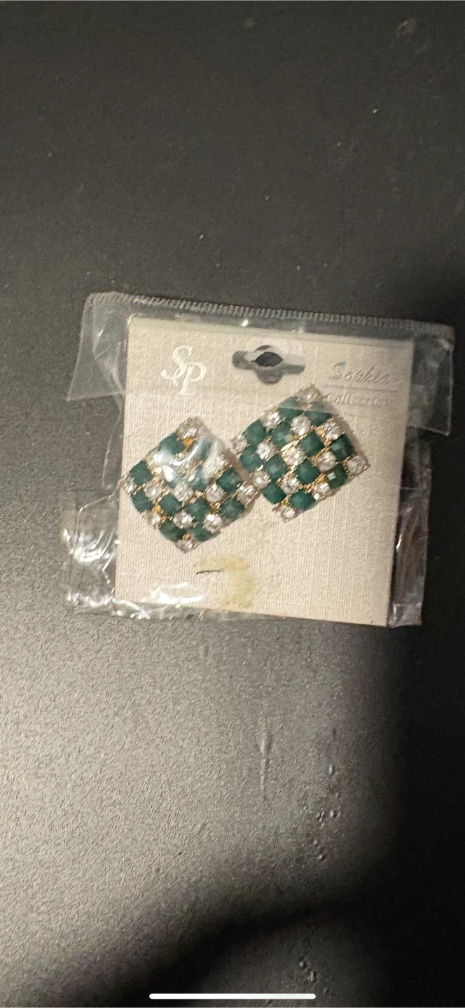 65Selling a pair of Sophia Collection earrings. They are green and have a diamond-like pattern. They are still in the original packaging