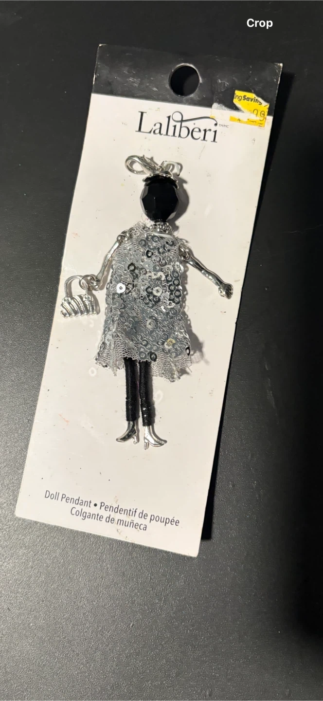 This is a Laliberi doll pendant. It has a black head and a silver dress with sequins. It also has a silver purse. It is still on its original packaging.