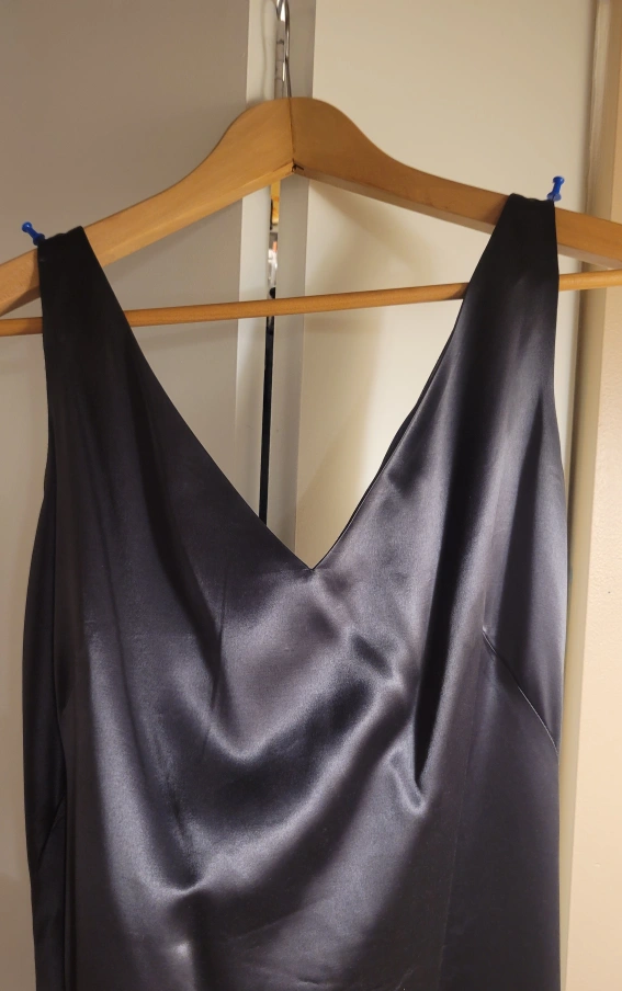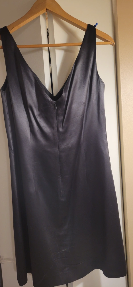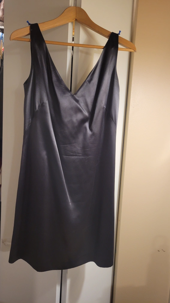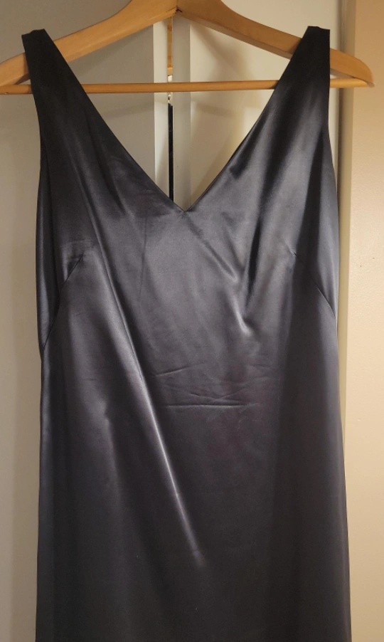This is a sleek gray satin dress with a V-neck and a sleeveless design. It's made of a smooth, satin-like material, lined for added luxury and comfort. It's in great condition and ready for a new home!