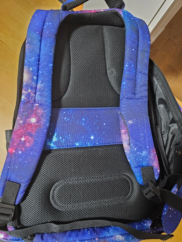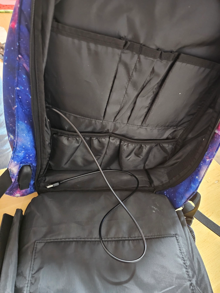 Selling a backpack with a cool galaxy print! It has multiple compartments inside to keep everything organized. The back is padded for extra comfort. Has a laptop compartment. Also has a charging cable to connect a portable charger! Perfect for school, travel, or everyday use, we have just outgrown the need for it.