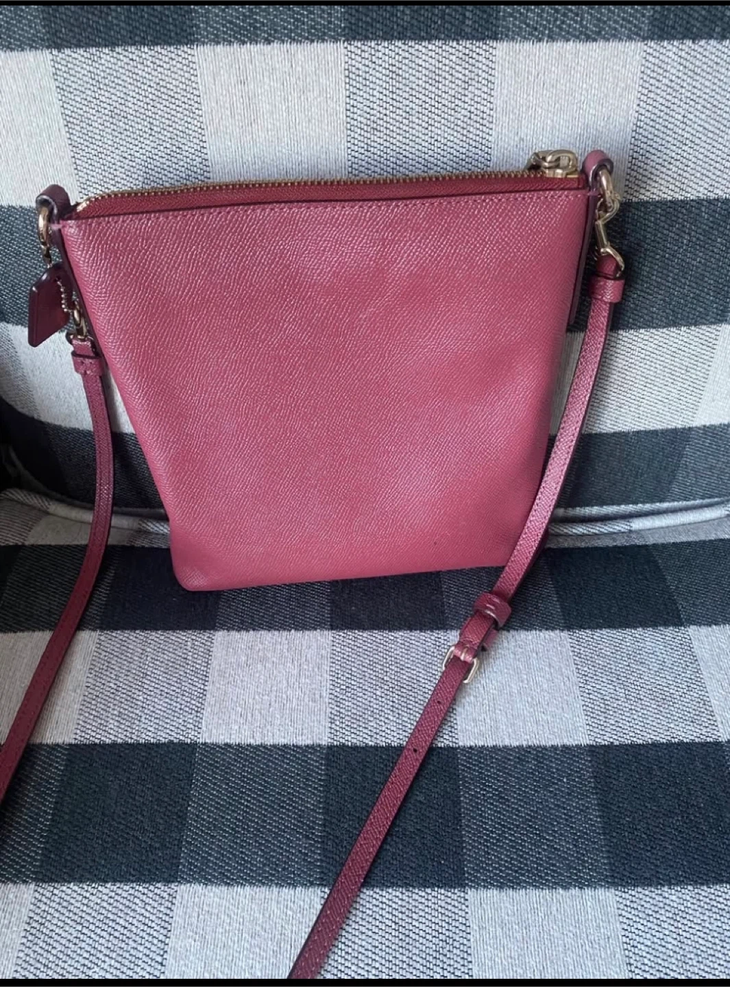 Selling a cute Coach crossbody bag in pink! It's in great condition and perfect for carrying your essentials. The bag features a zip closure and an adjustable strap. Great for everyday use!