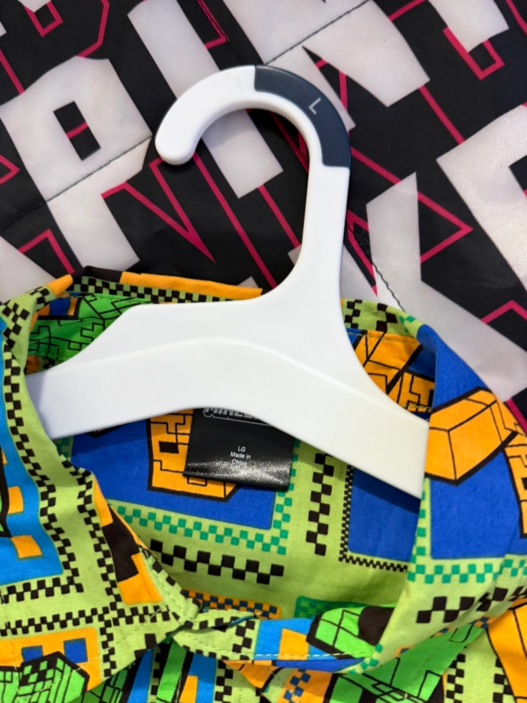 Selling a Minecraft button-down shirt in size large. The shirt features a colorful and fun Minecraft-themed pattern. It's in great condition and ready for a new home!