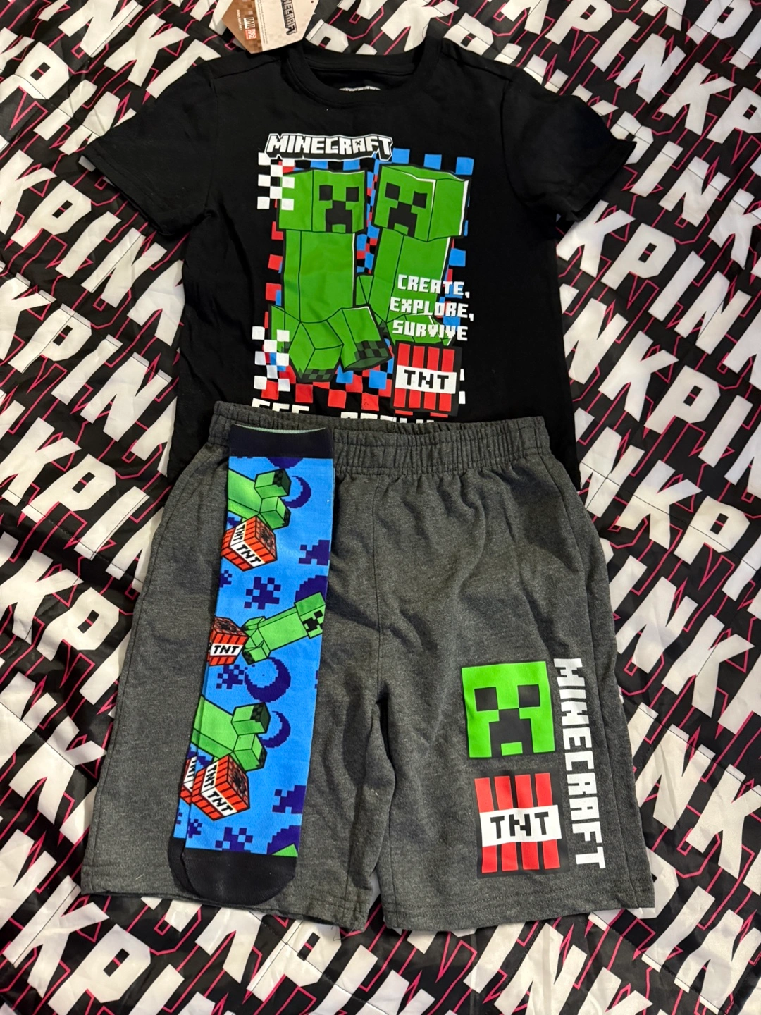 Minecraft outfit set for boys! Includes a black t-shirt with a Creeper design, gray shorts with a Minecraft logo, and blue Minecraft socks. Perfect for any young Minecraft fan