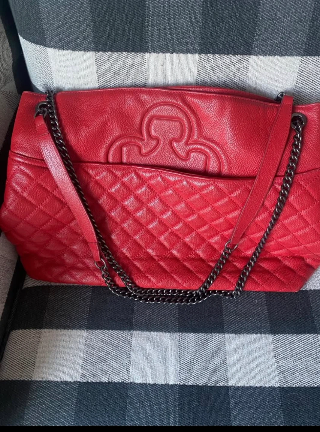 27This is a red Tory Burch shoulder bag. It features a quilted design and chain straps. The bag is in good condition and ready for a new home!