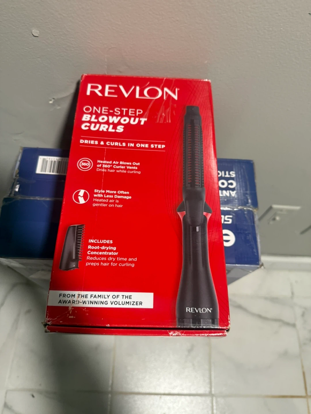 Selling a Revlon One-Step Blowout Curls styler! It dries and curls in one step. It features heated air that blows out at 360° curler vents, and styles more often with reduced air speed, gentler on hair. Includes a root-drying concentrator that saves time and preps hair for curling. Comes with the box!
