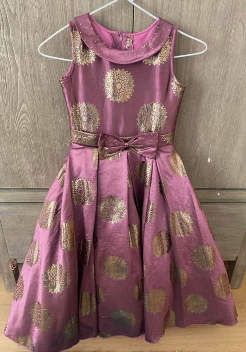 27This is a beautiful dress for a special occasion! It features a pink fabric with gold circular accents and a matching bow at the waist. Perfect for parties or events!