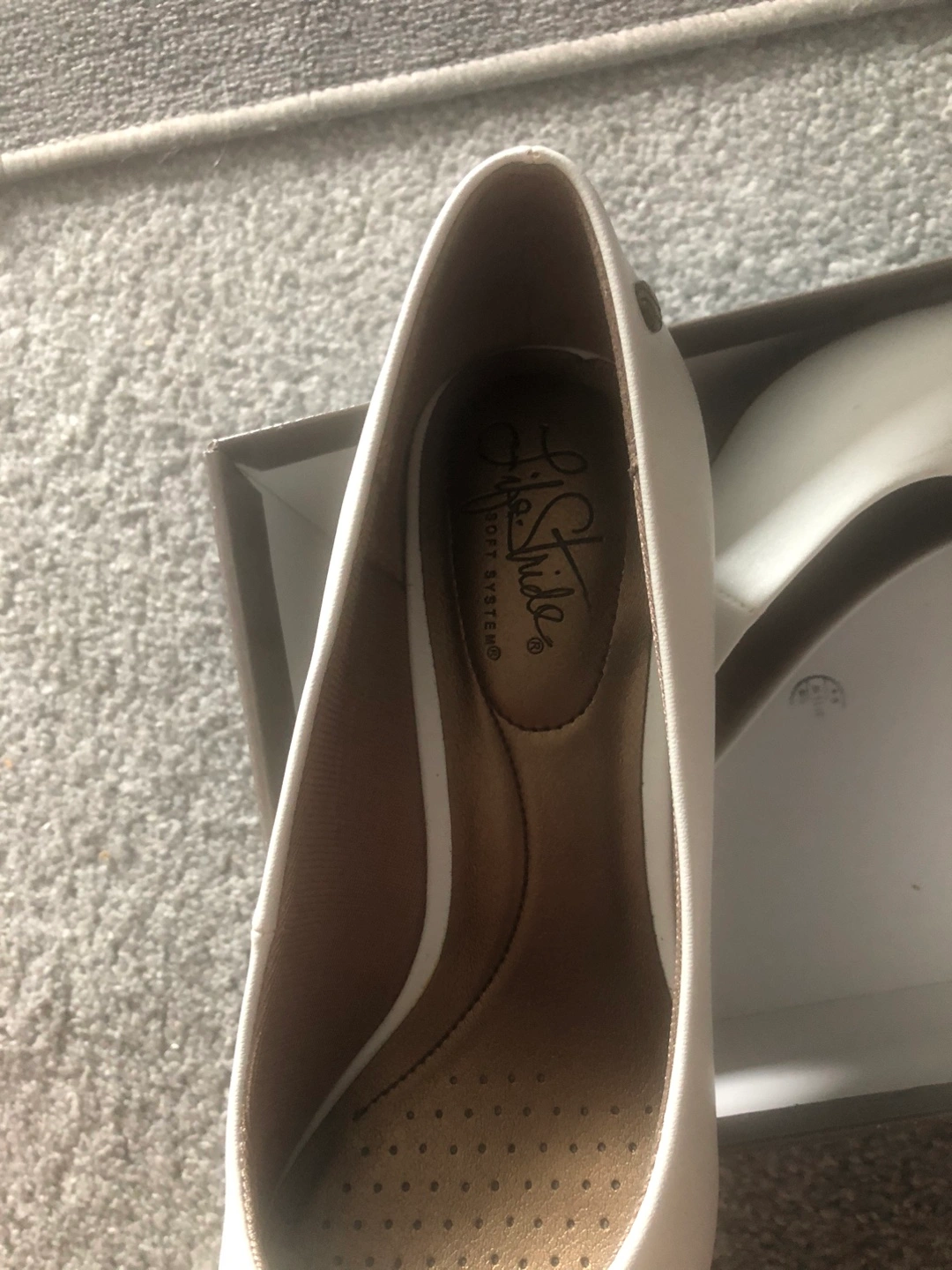 70Selling a pair of Life Stride white heels. They come with the original box. These heels feature comfort support and a highly flexible outsole 7M