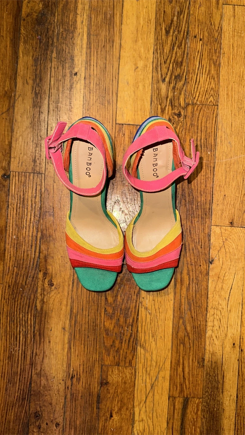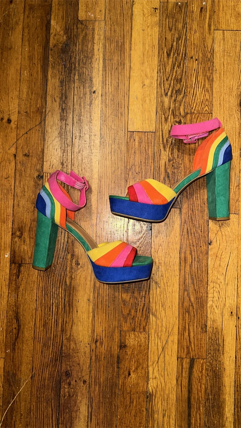 65These fun rainbow heels are sure to brighten your day! They feature a colorful striped design and a comfortable block heel. Perfect for adding a pop of color to any outfit
