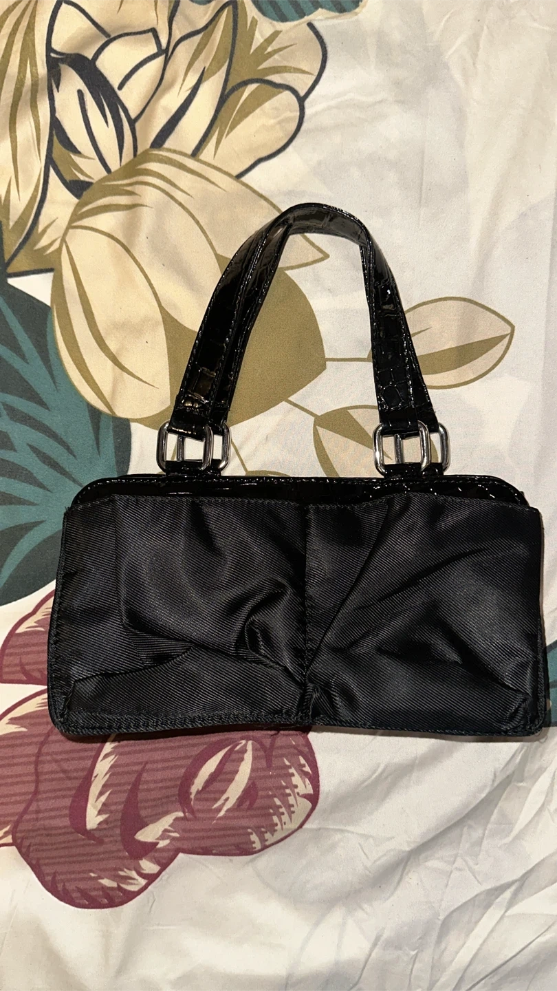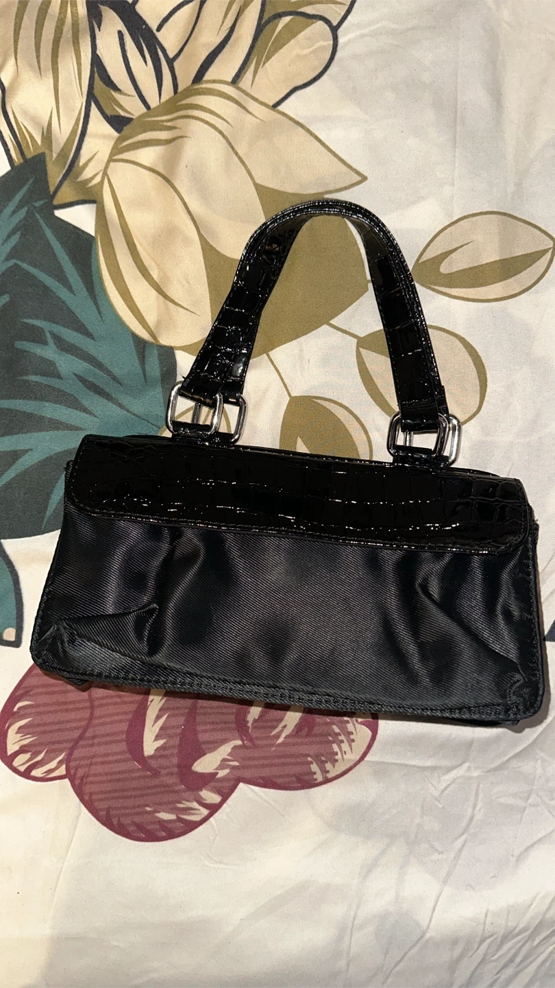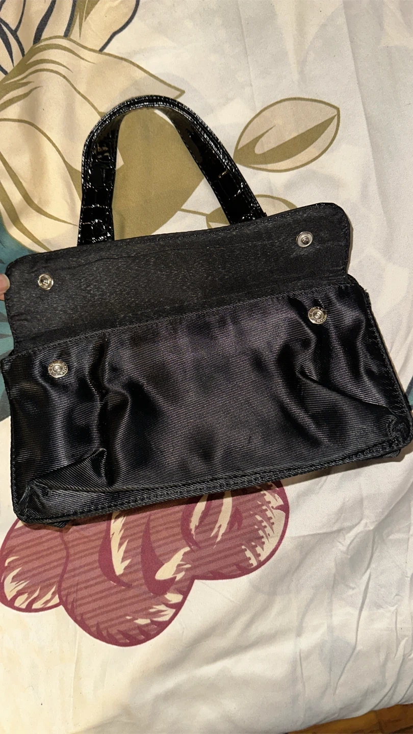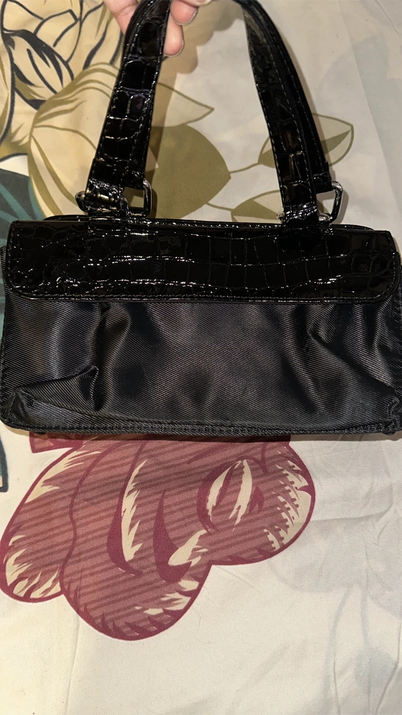 Selling a cute black handbag from Curate Style! It's in great condition and perfect for a night out or a day of shopping. The bag has a unique crocodile-like texture on the top flap and handles, adding a touch of style. It features a zipper and snap closures to keep your belongings secure
