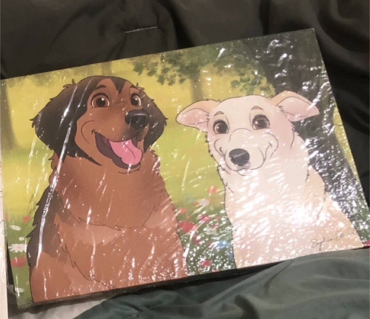 Here's a cute cartoon canvas art print featuring two adorable dogs! It's still sealed in its original packaging, so it's in perfect condition