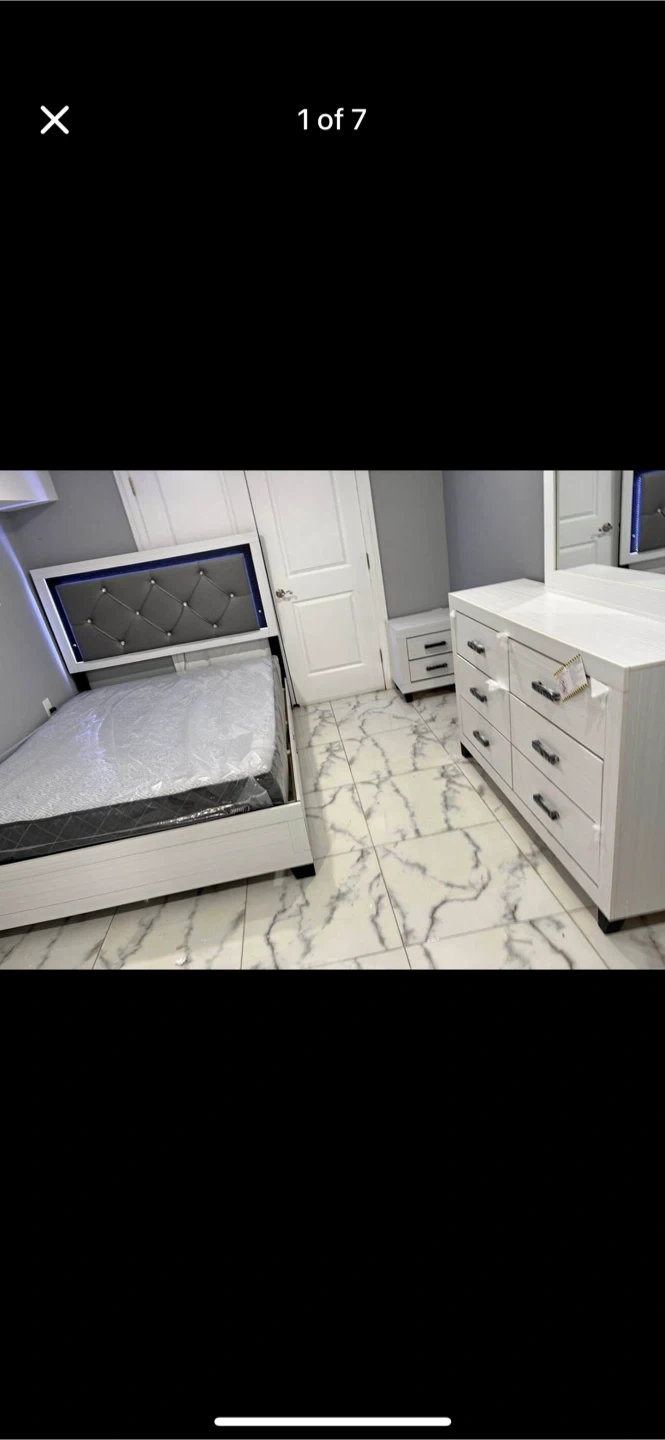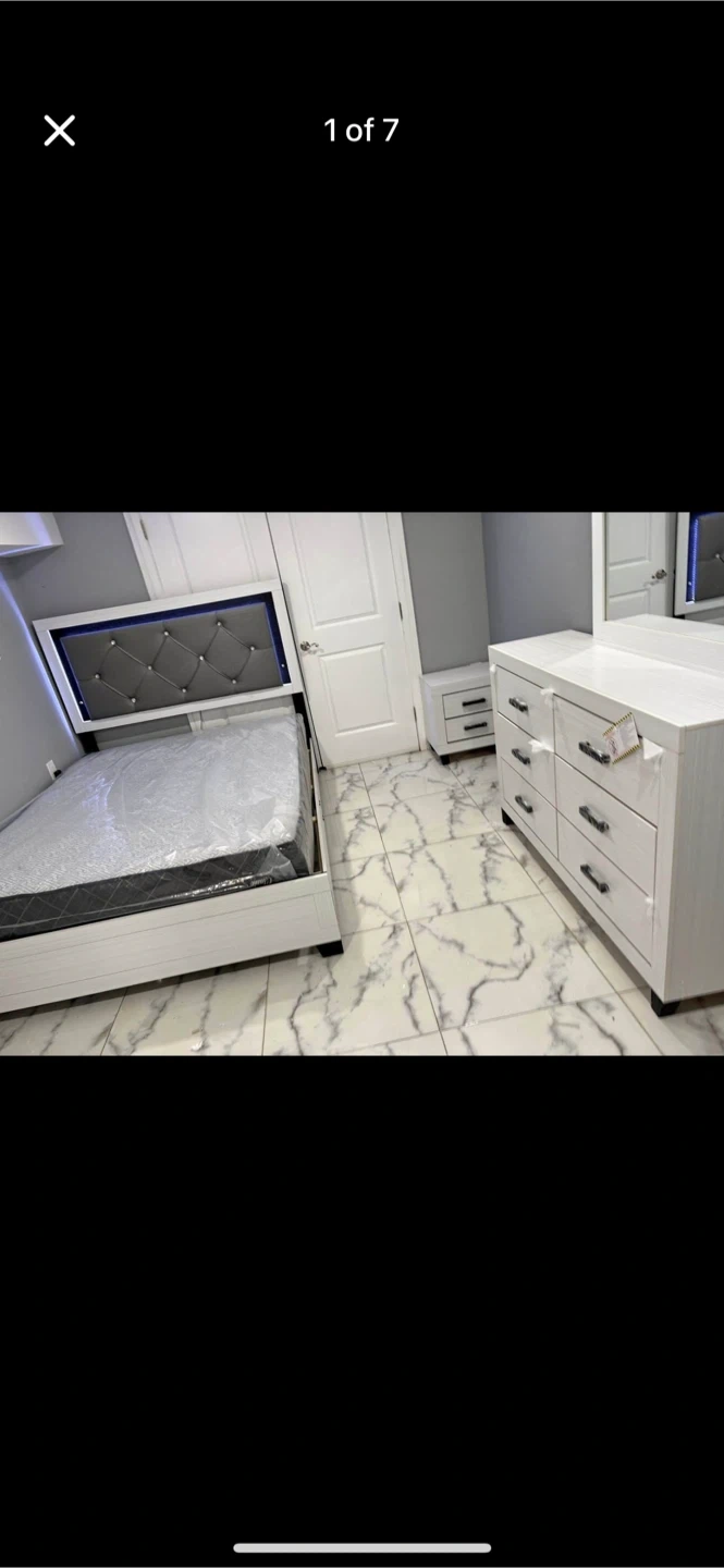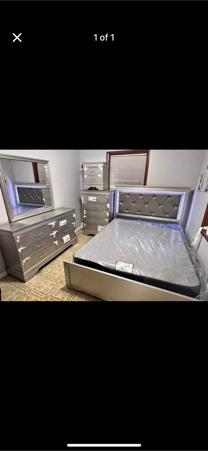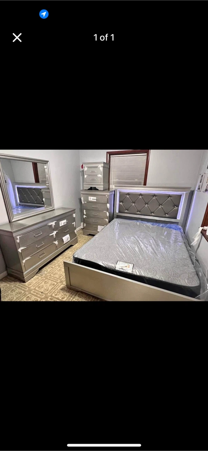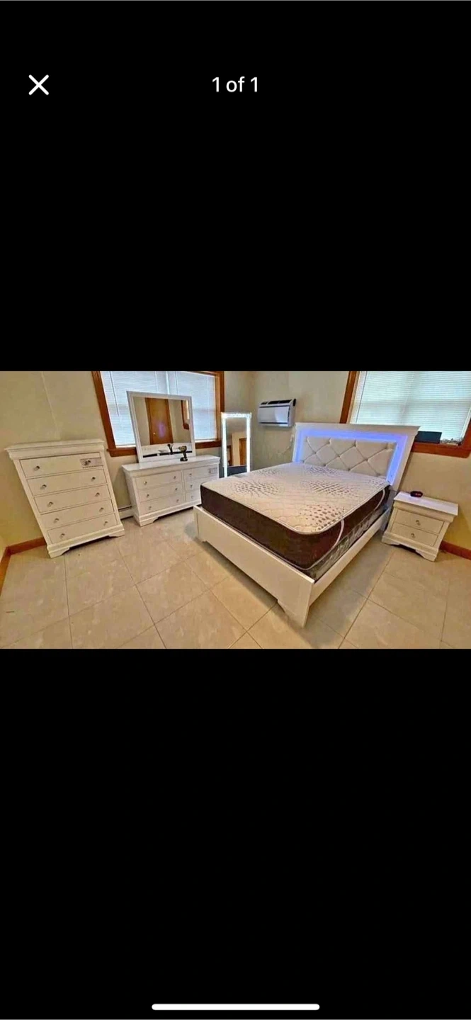 Selling a complete bedroom set that includes a bed, dresser, mirror, and one nightstands. The set appears to be in great condition and ready to furnish your space!
