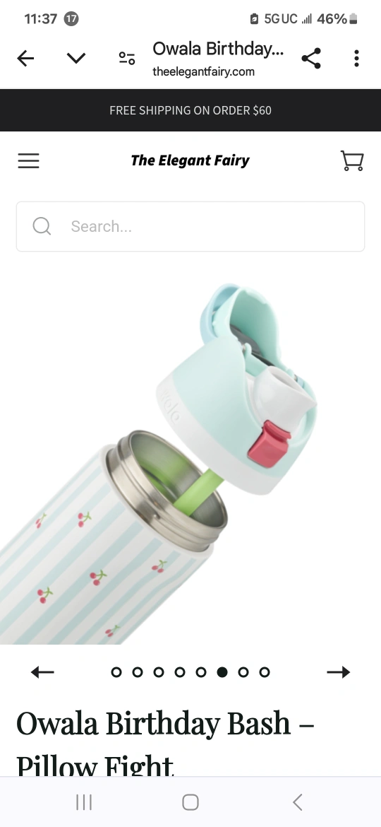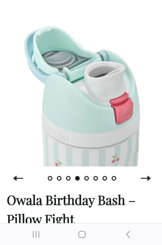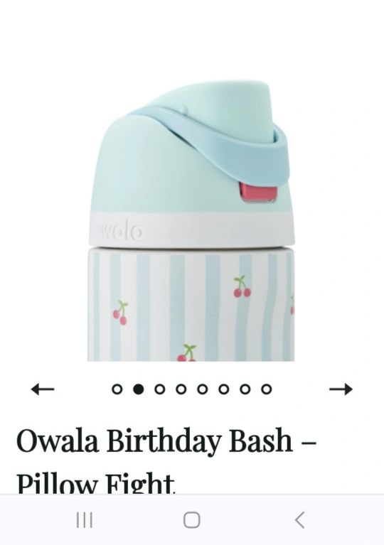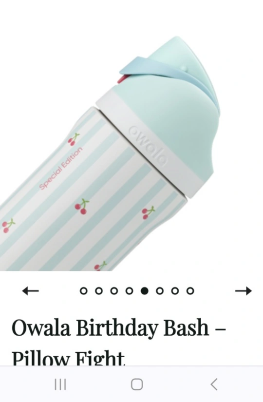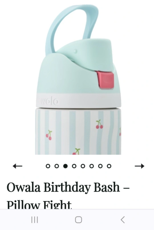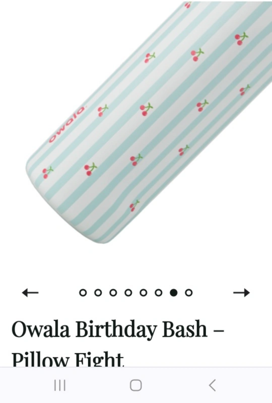 Selling a cute Owala water bottle in the Birthday Bash Pillow Fight design! It's a special edition and features a light blue and white striped pattern with little cherries. Perfect for staying hydrated in style!