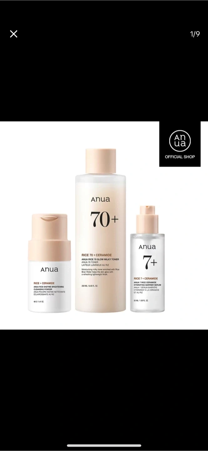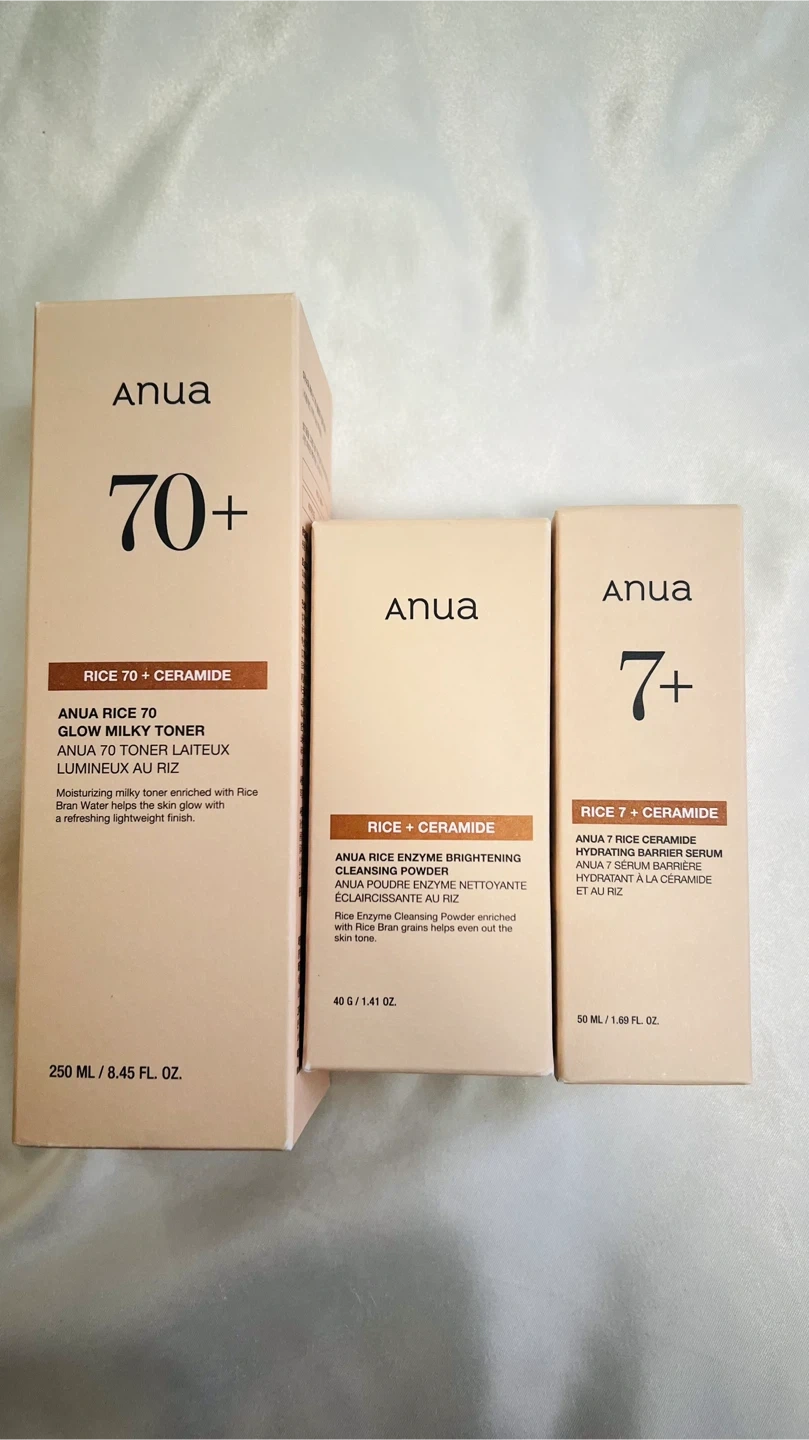 70This is an Anua Rice 70+ Glow Milky Toner Set! - Anua Rice 70 Glow Milky Toner - Anua Rice Enzyme Brightening Cleansing Powder - Anua 7 Rice + Ceramide Hydrating Barrier Serum Moisturizing milky toner enriched with rice and ceramide to leave your skin with a refreshing lightweight finish!