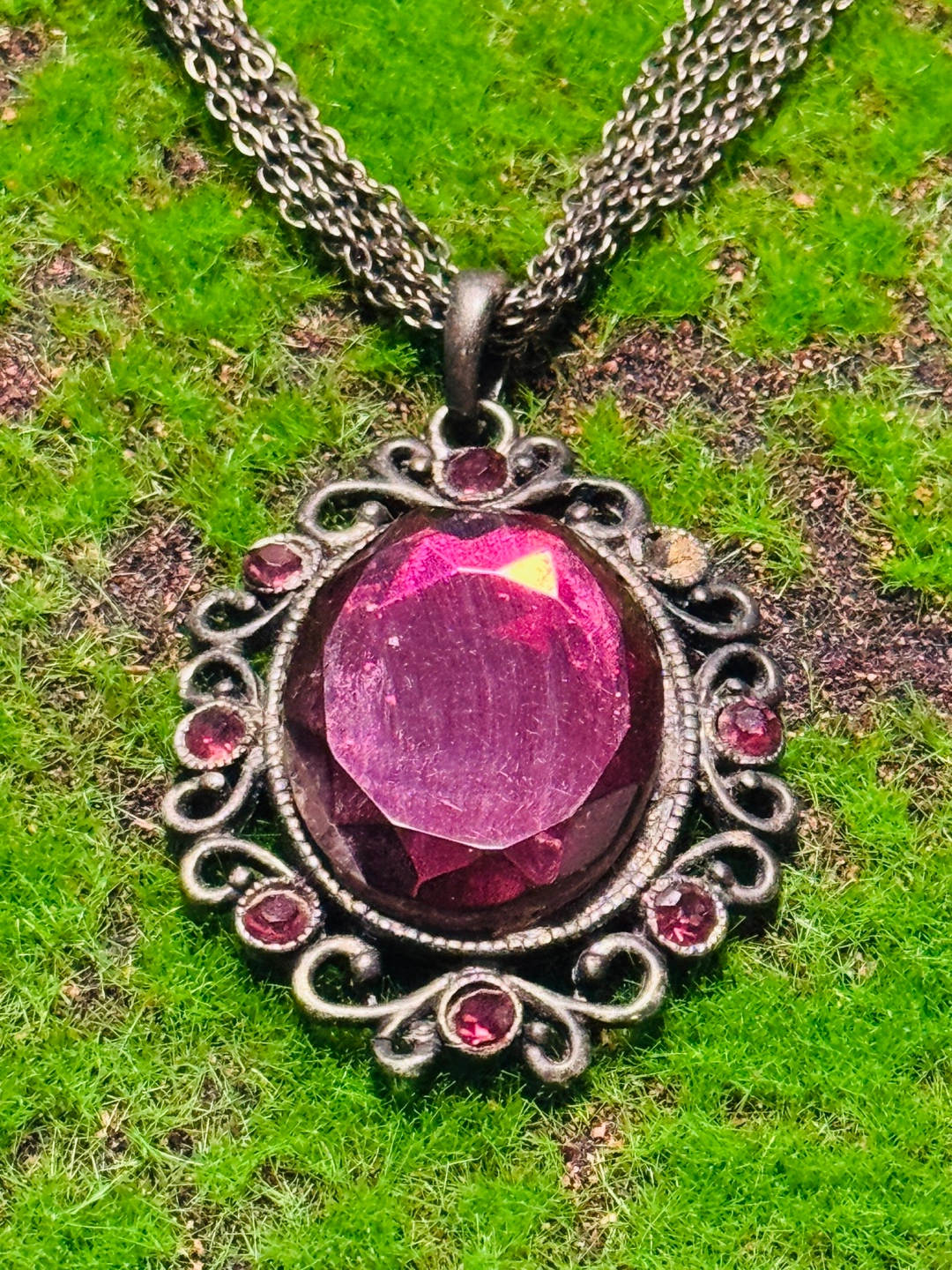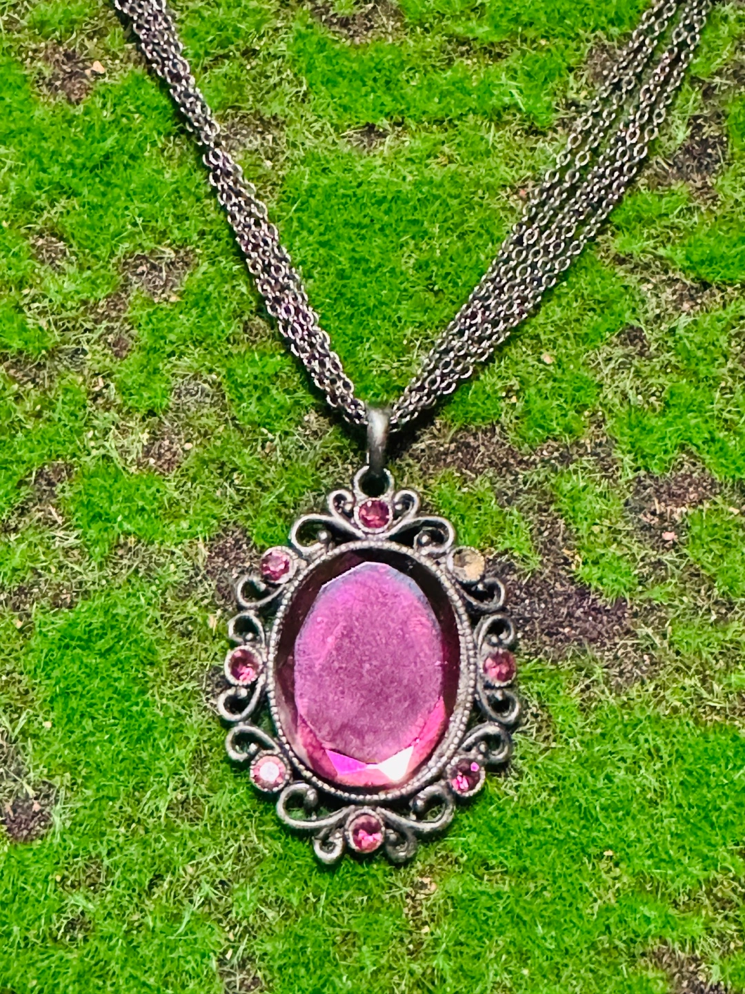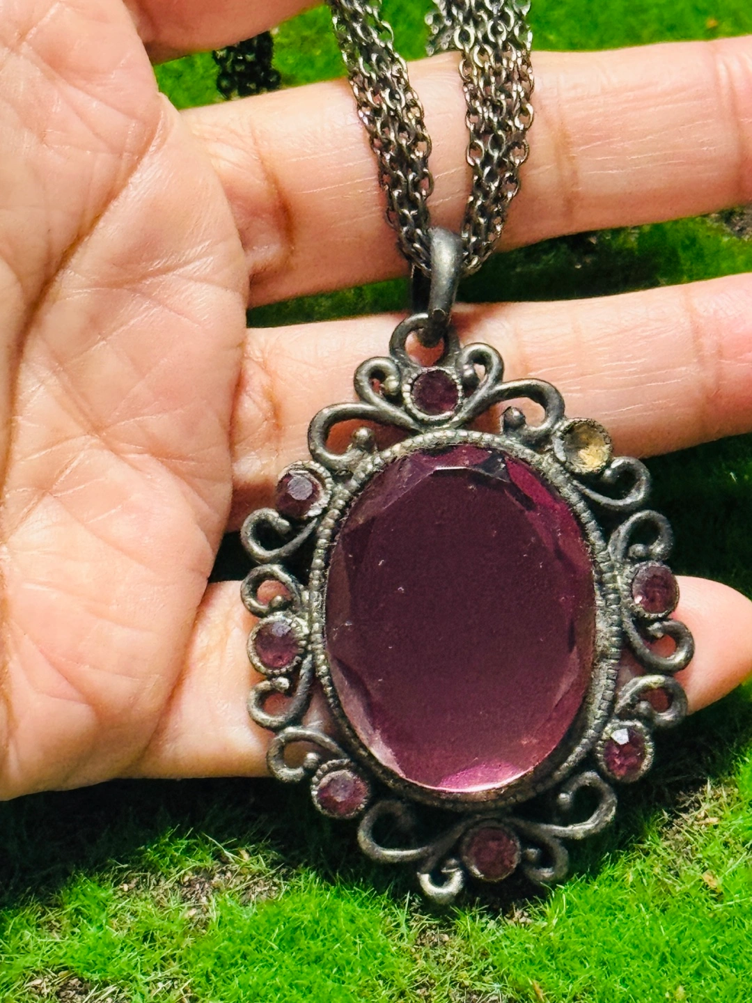 Selling a beautiful vintage-style pendant necklace! The pendant features a large purple stone surrounded by smaller pink stones and an ornate metal frame. The chain is a multi-strand design in a dark metal finish. It's a unique piece that's sure to add a touch of elegance to any outfit