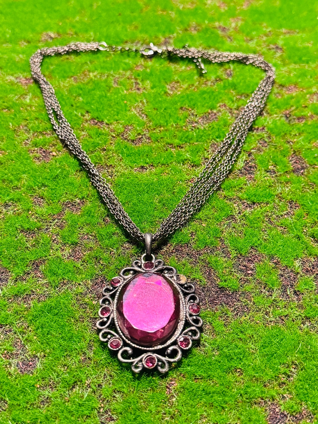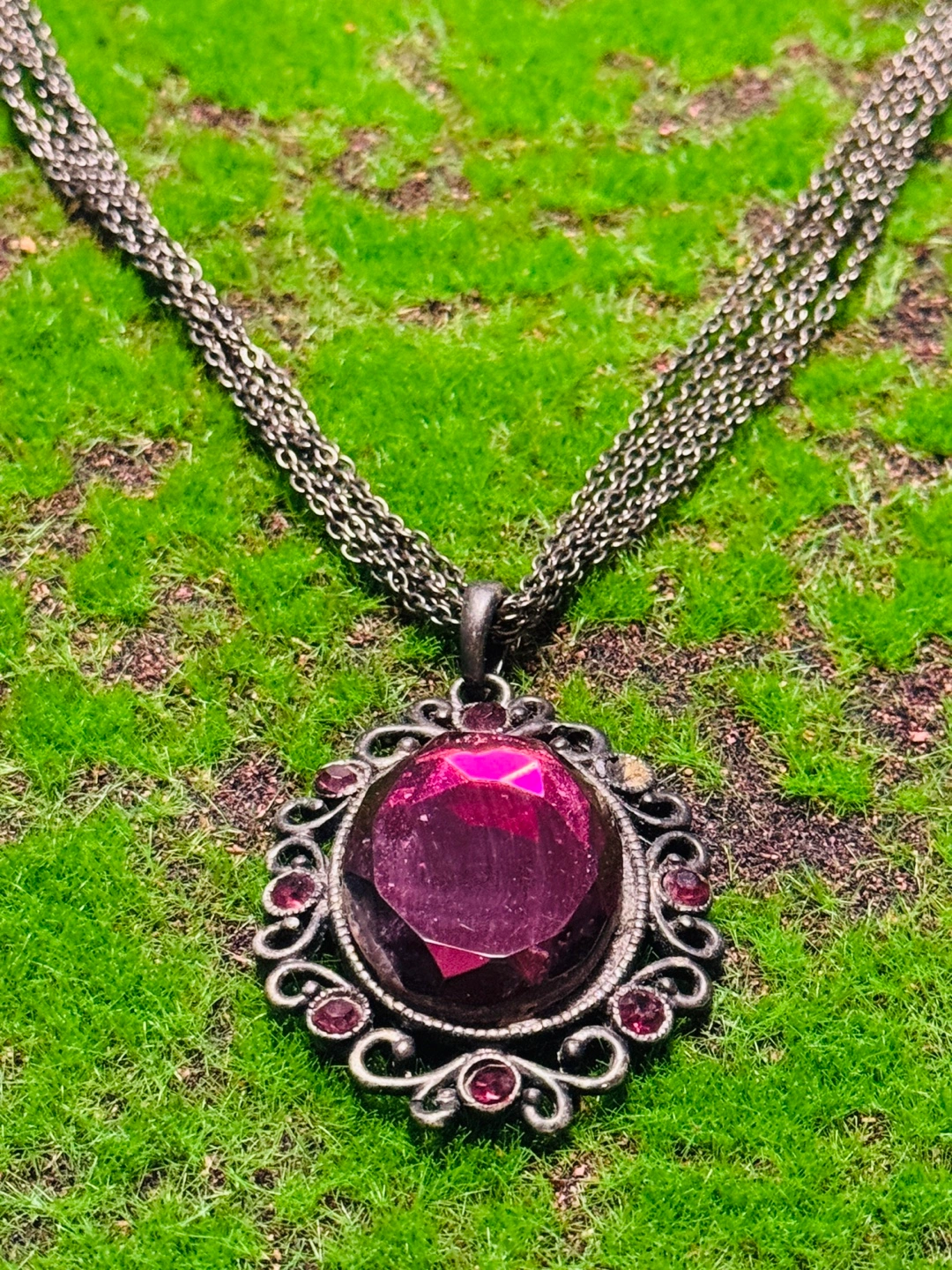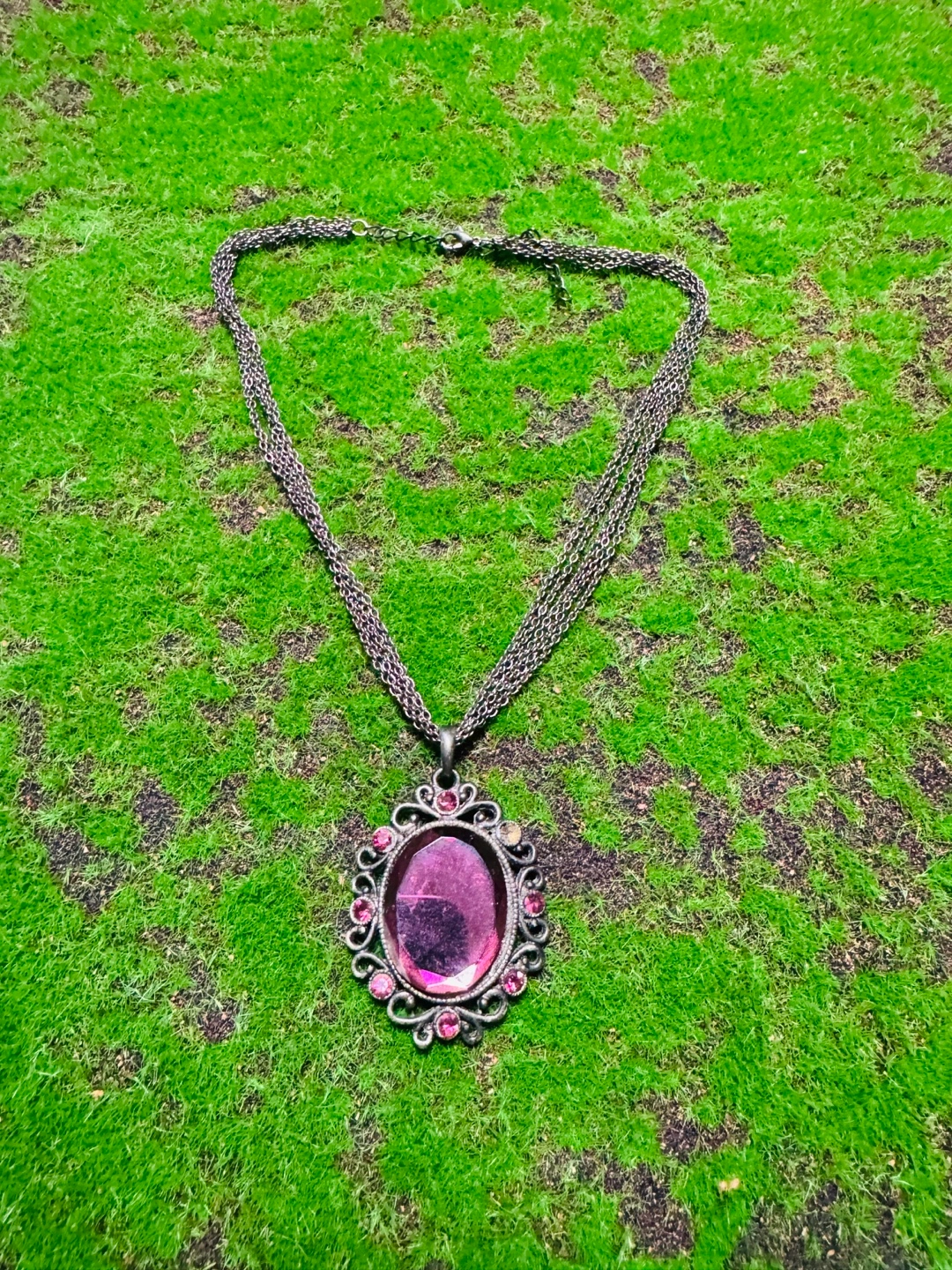 Selling a beautiful vintage-style pendant necklace! The pendant features a large purple stone surrounded by smaller pink stones and an ornate metal frame. The chain is a multi-strand design in a dark metal finish. It's a unique piece that's sure to add a touch of elegance to any outfit