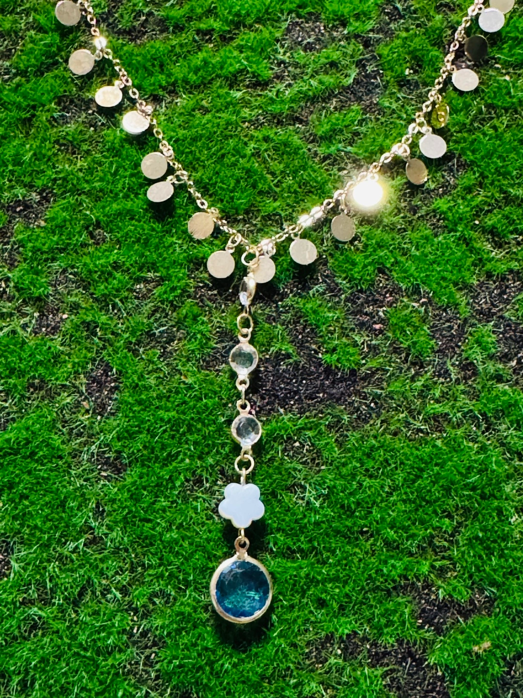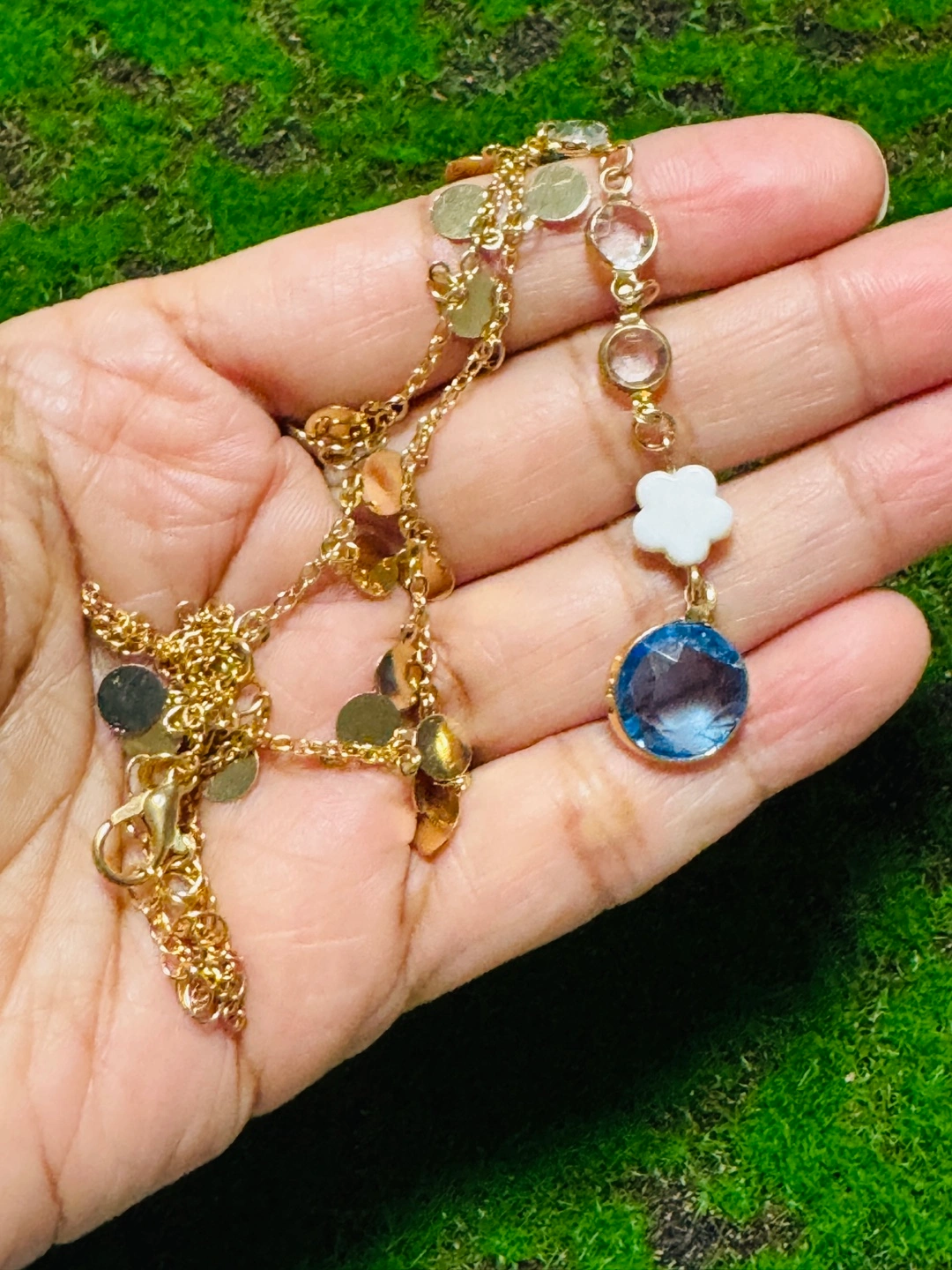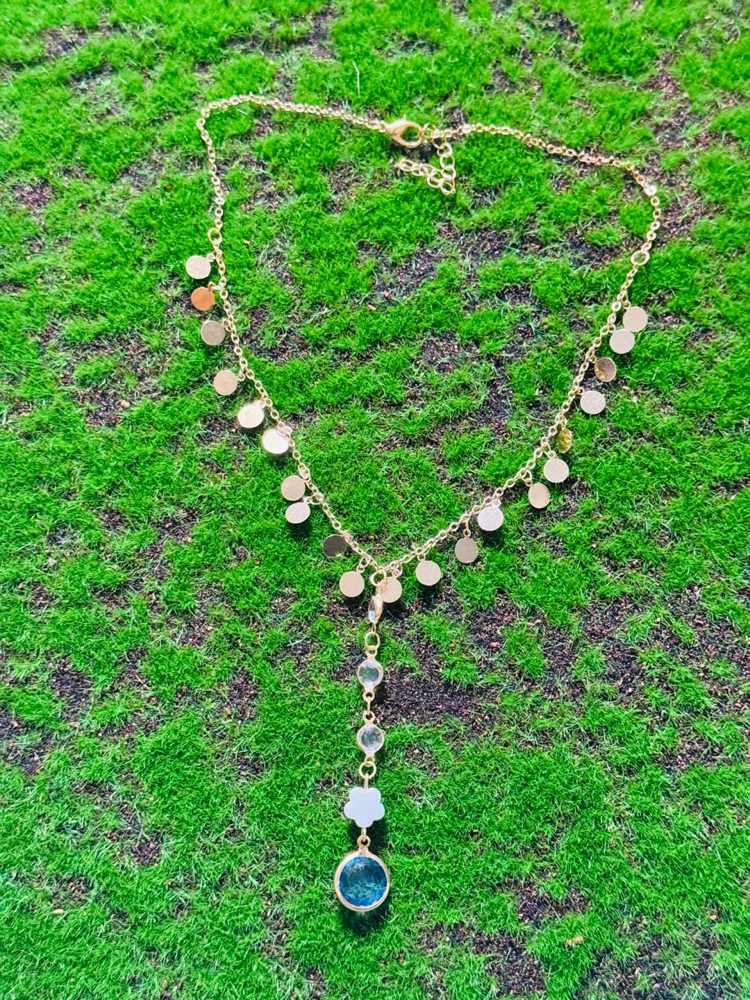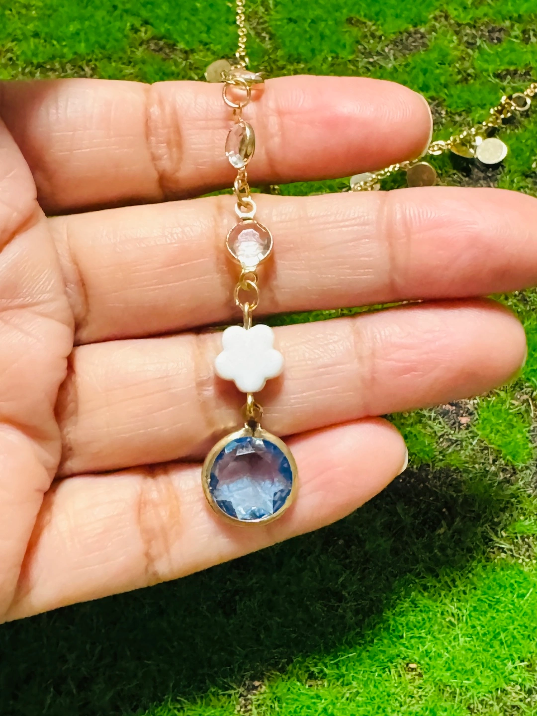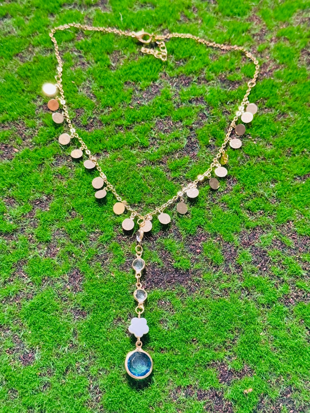 This is a gold-tone fashion necklace. It features a series of small, round discs along the chain, with a drop pendant consisting of clear stones, a white flower-shaped piece, and a larger blue stone at the bottom. It's in great condition!