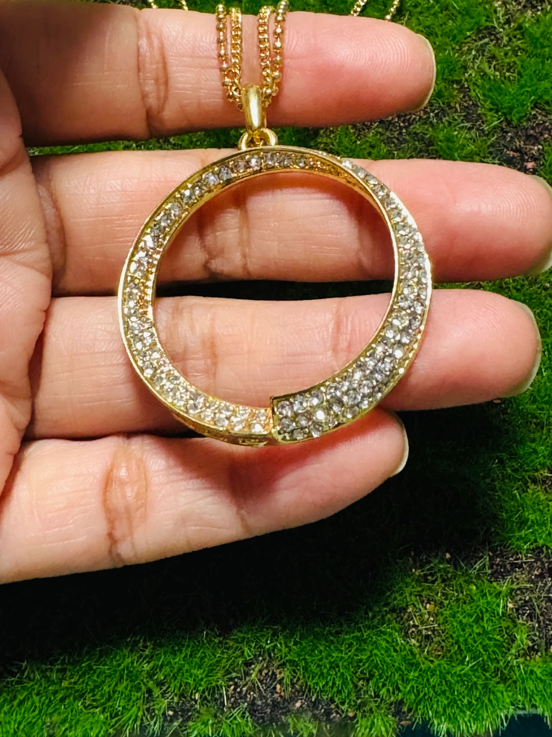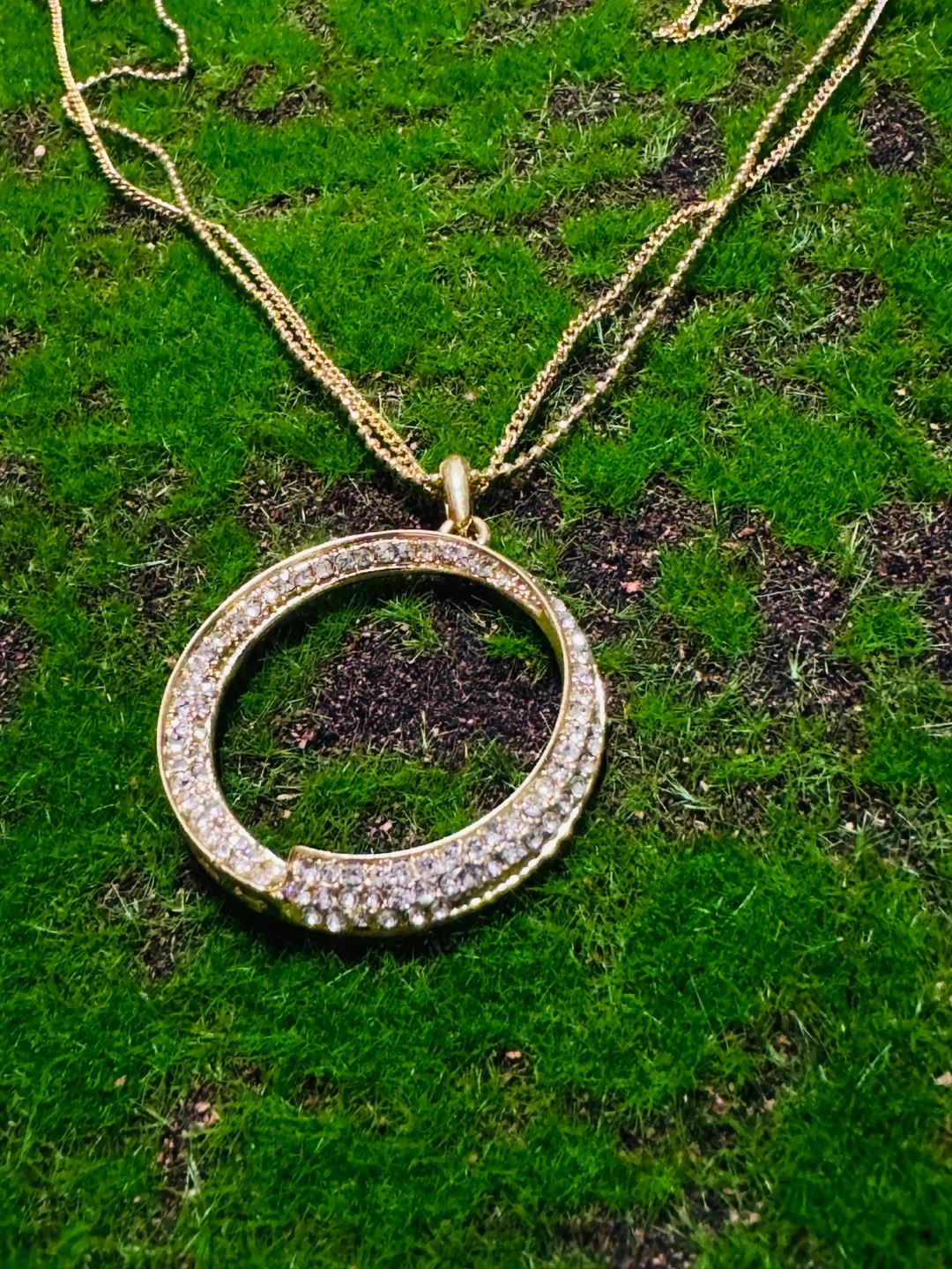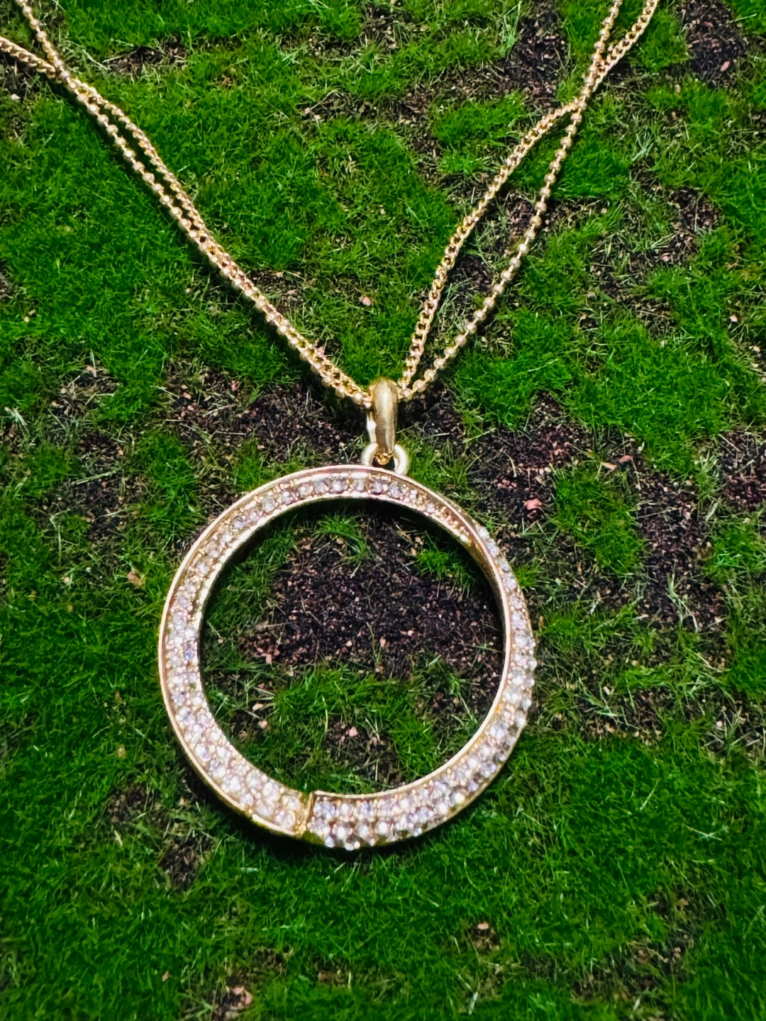 This is a gold-tone necklace featuring a circular pendant. The pendant is adorned with clear stones that give it a bit of sparkle. It's in good condition and ready to add a touch of shine to your outfit!