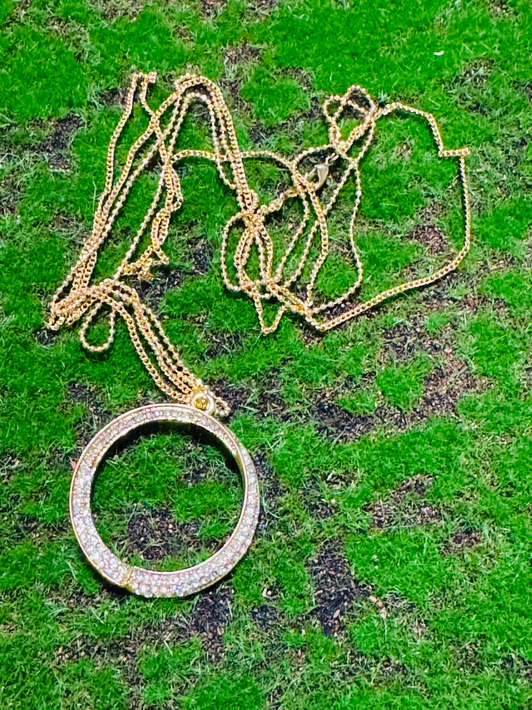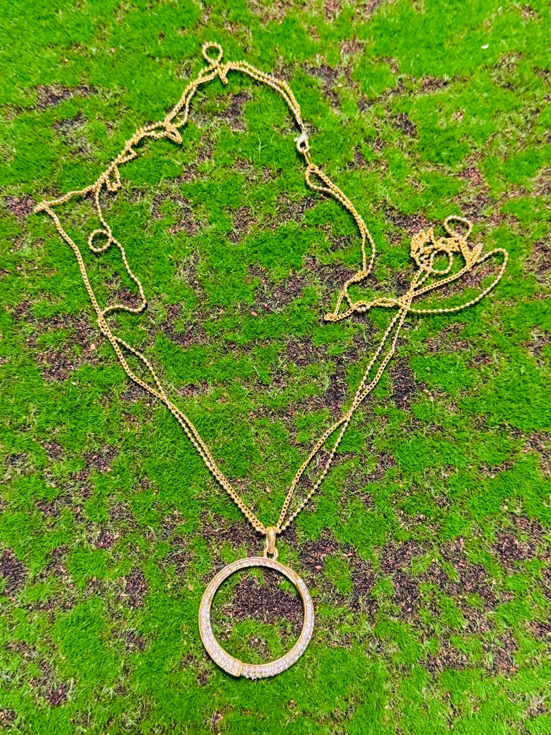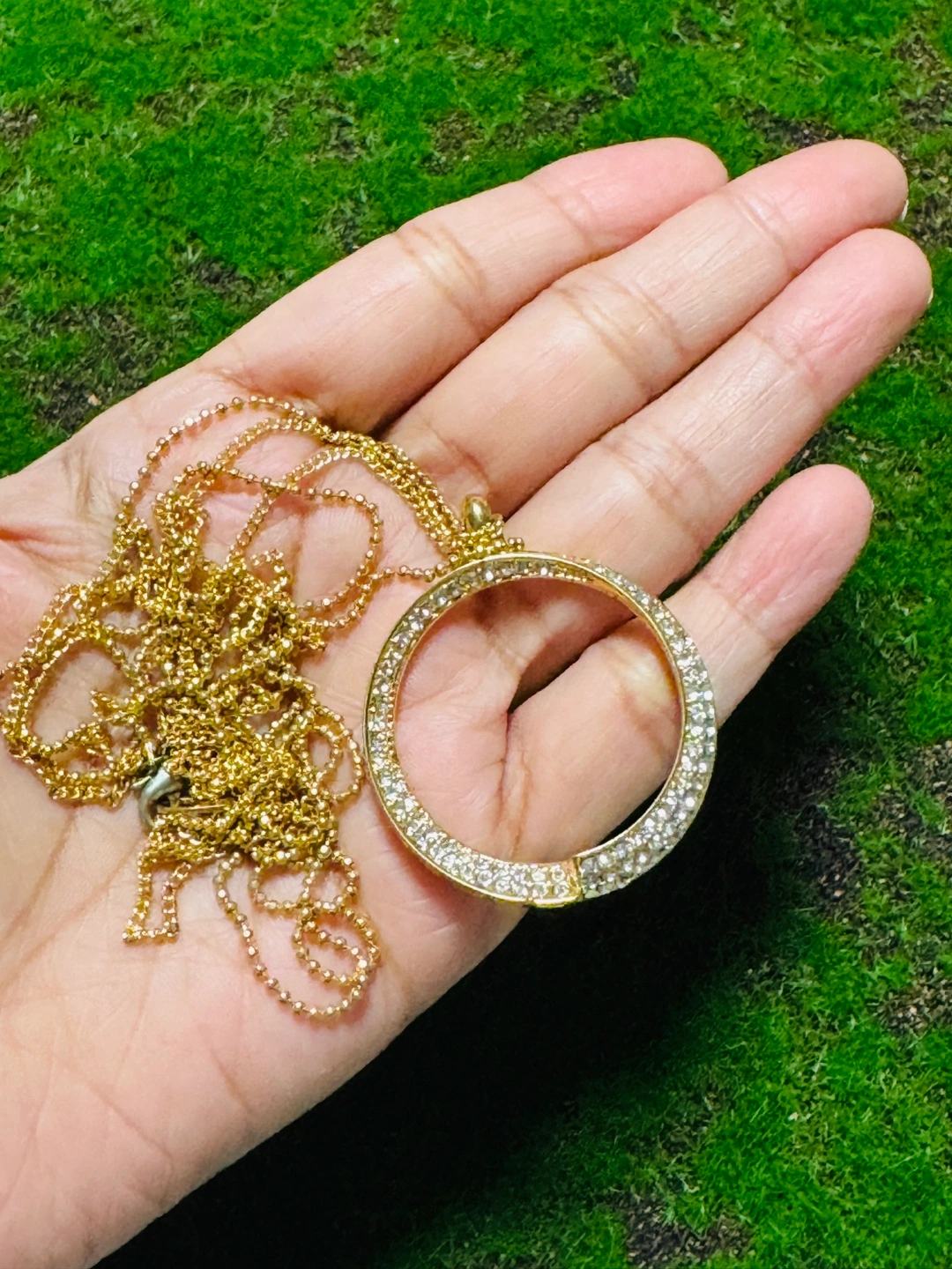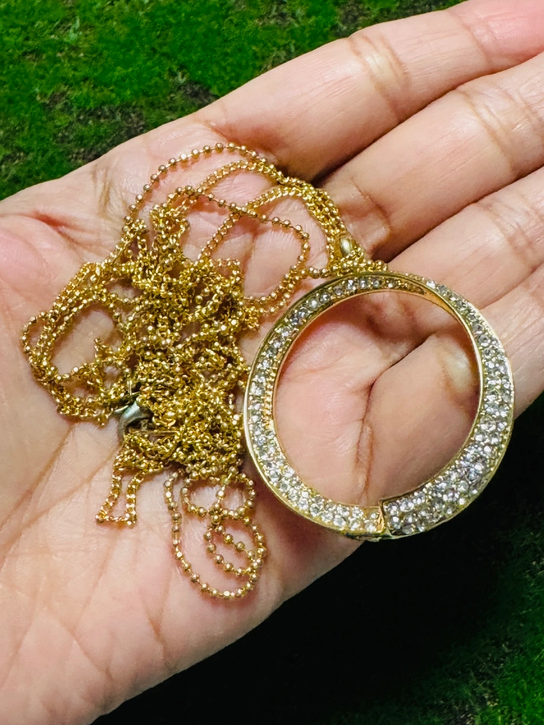This is a gold-tone necklace featuring a circular pendant. The pendant is adorned with clear stones that give it a bit of sparkle. It's in good condition and ready to add a touch of shine to your outfit!