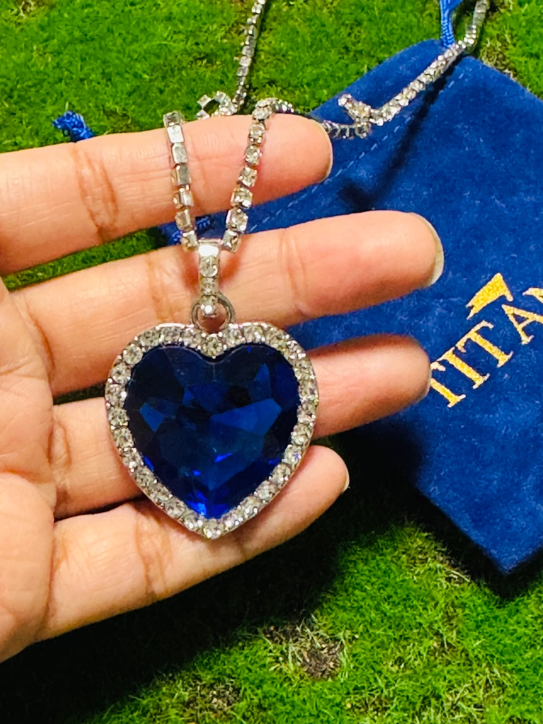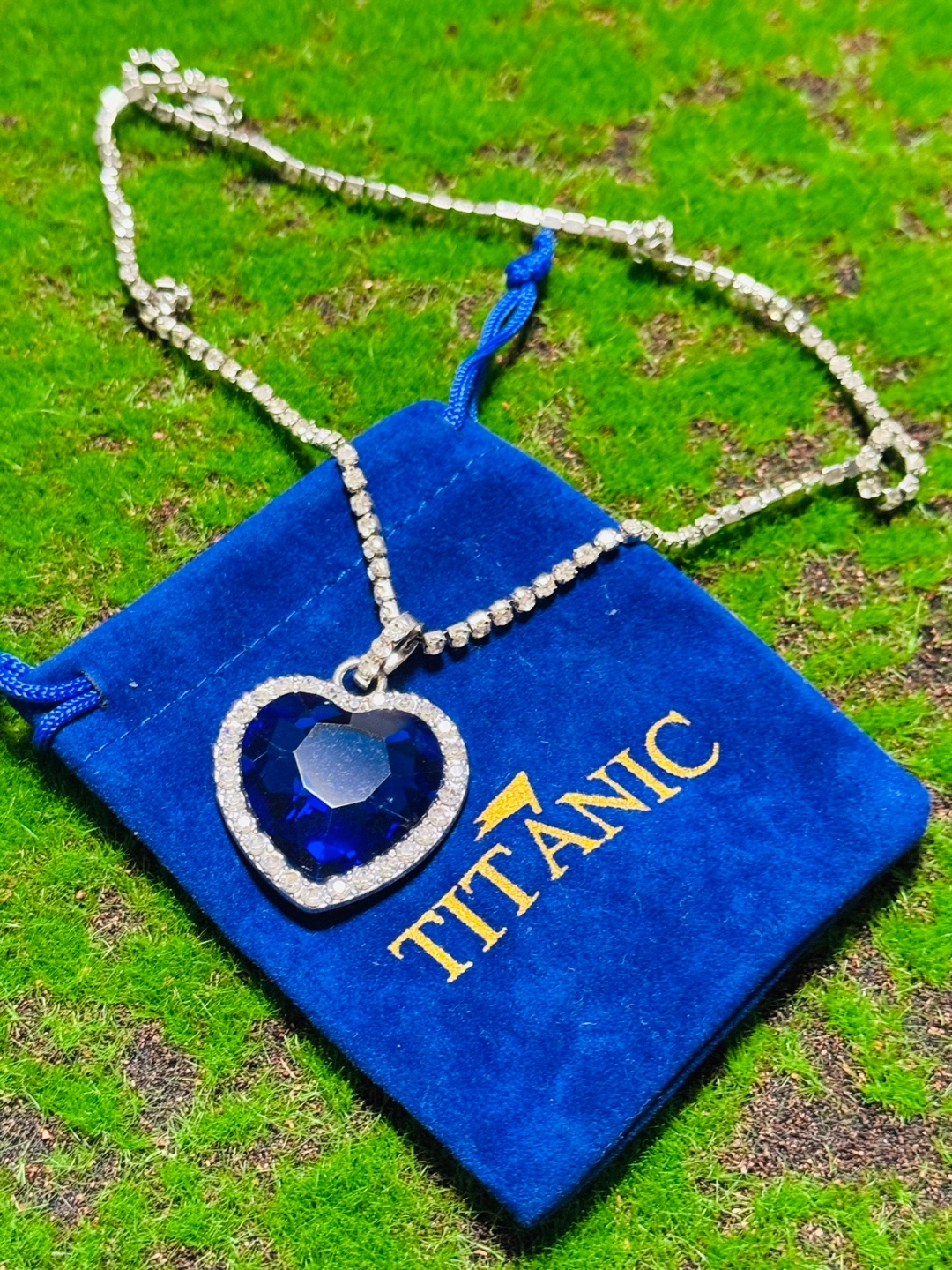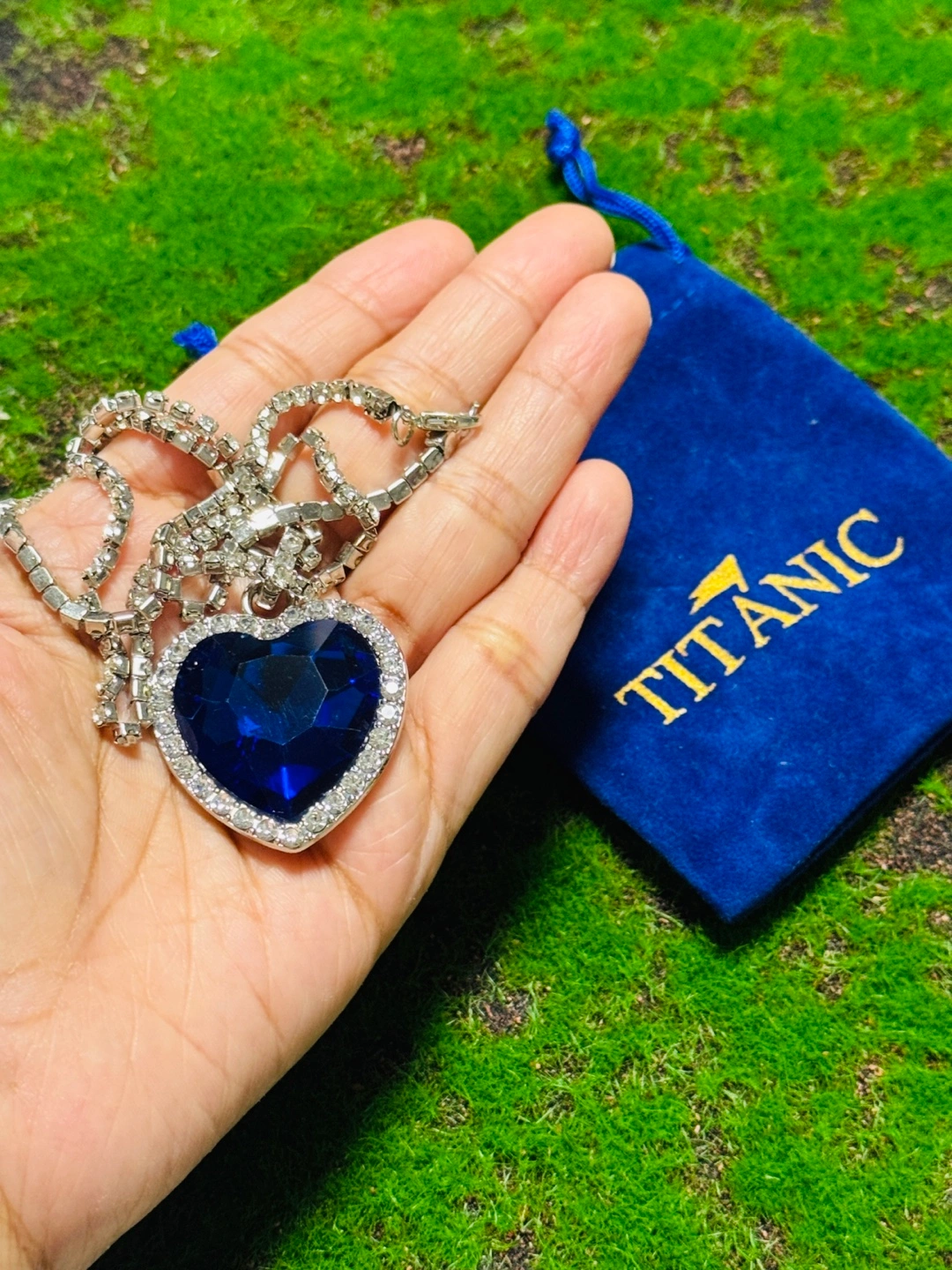 Selling a beautiful Titanic Heart of the Ocean necklace! It features a large, blue heart-shaped pendant surrounded by clear crystals. Comes with a blue velvet pouch with the Titanic logo on it