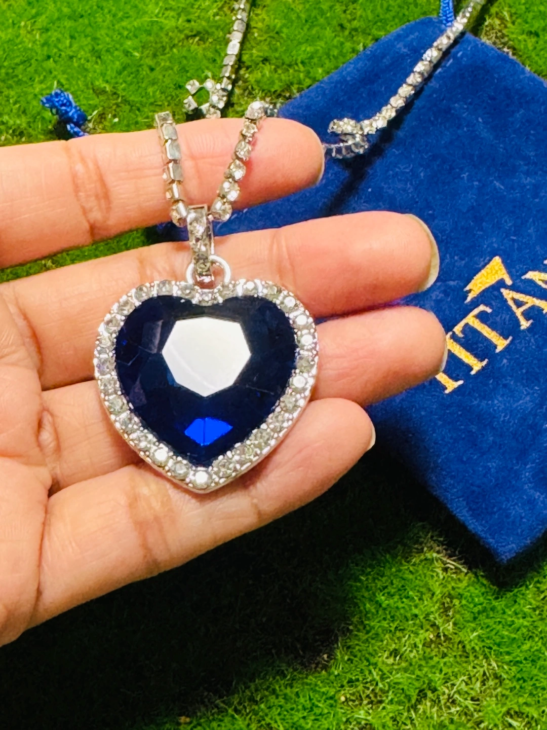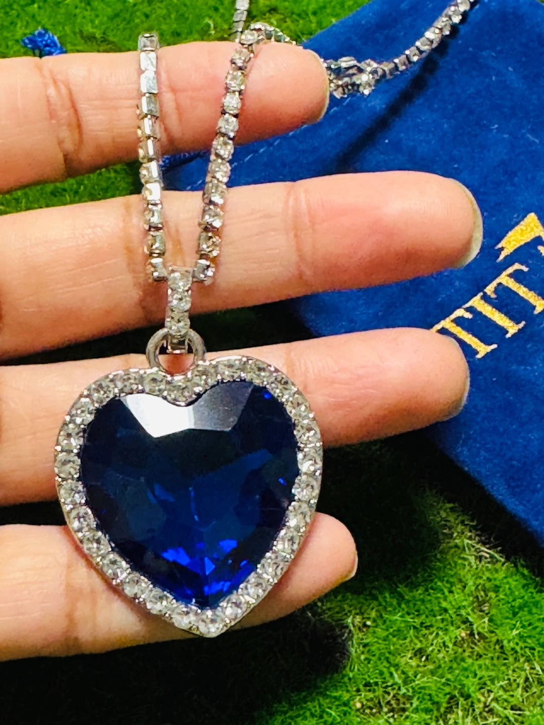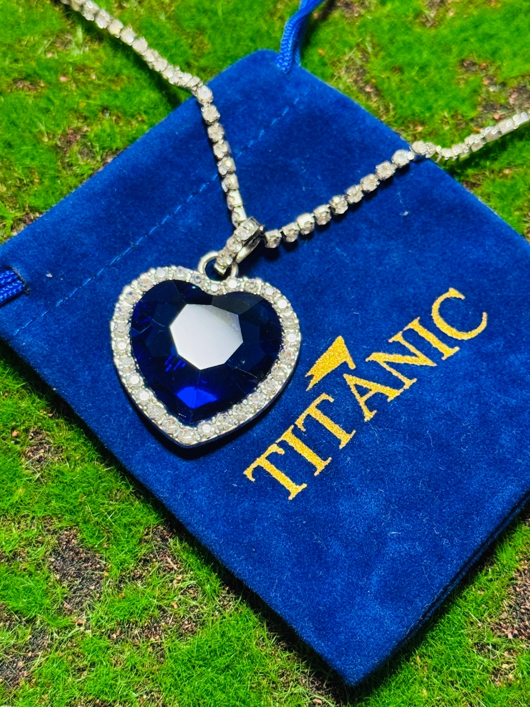 Selling a beautiful Titanic Heart of the Ocean necklace! It features a large, blue heart-shaped pendant surrounded by clear crystals. Comes with a blue velvet pouch with the Titanic logo on it