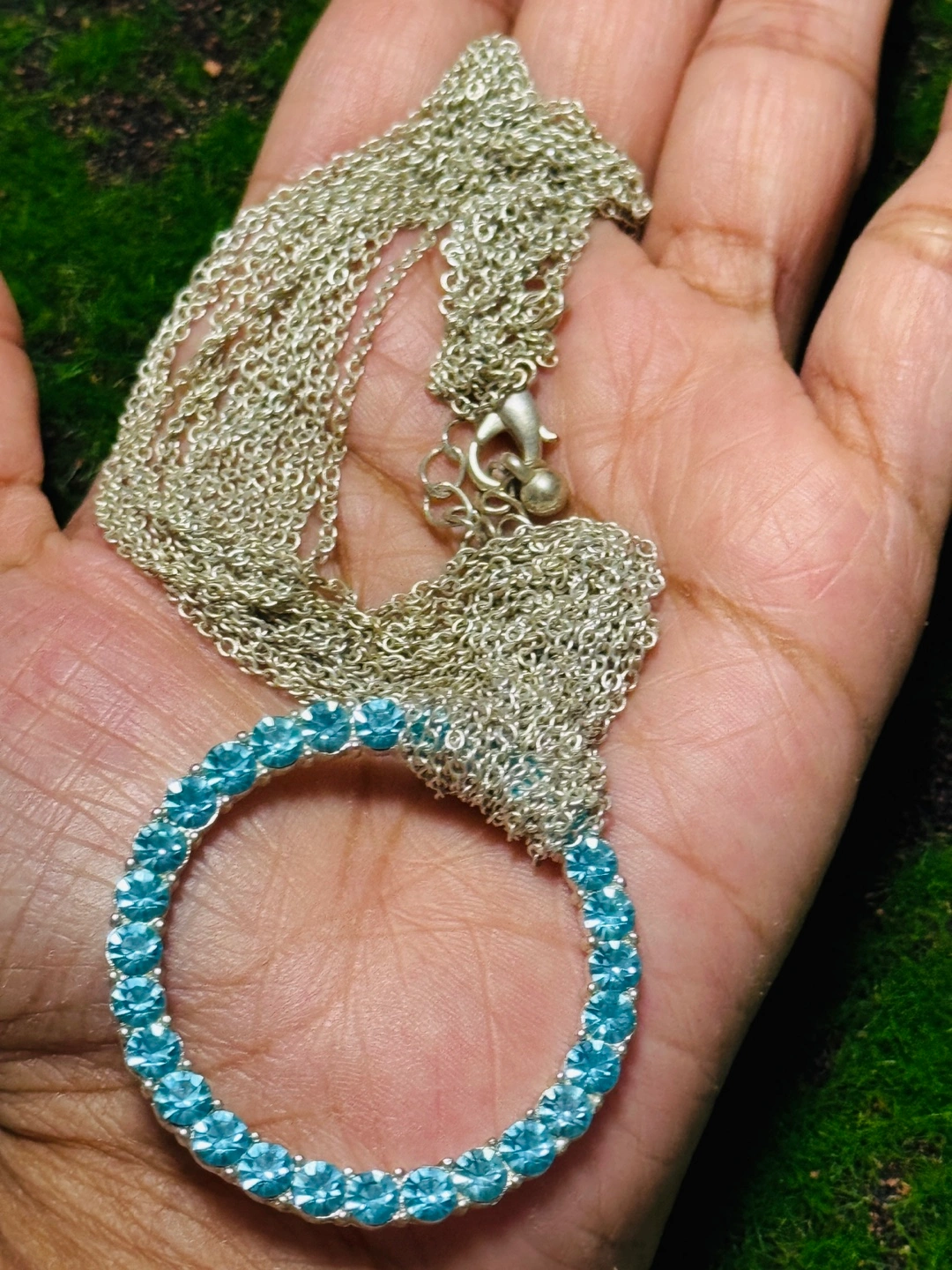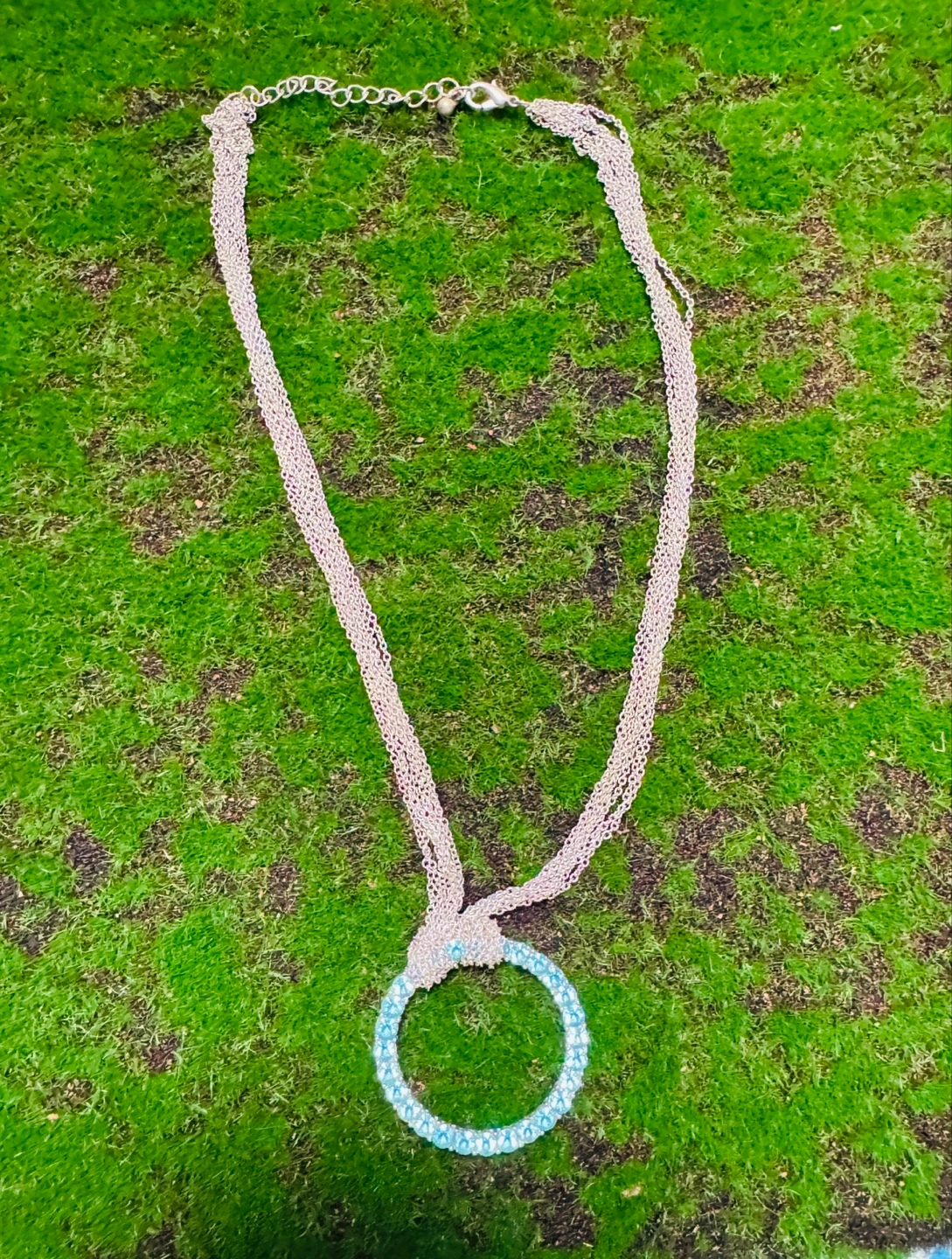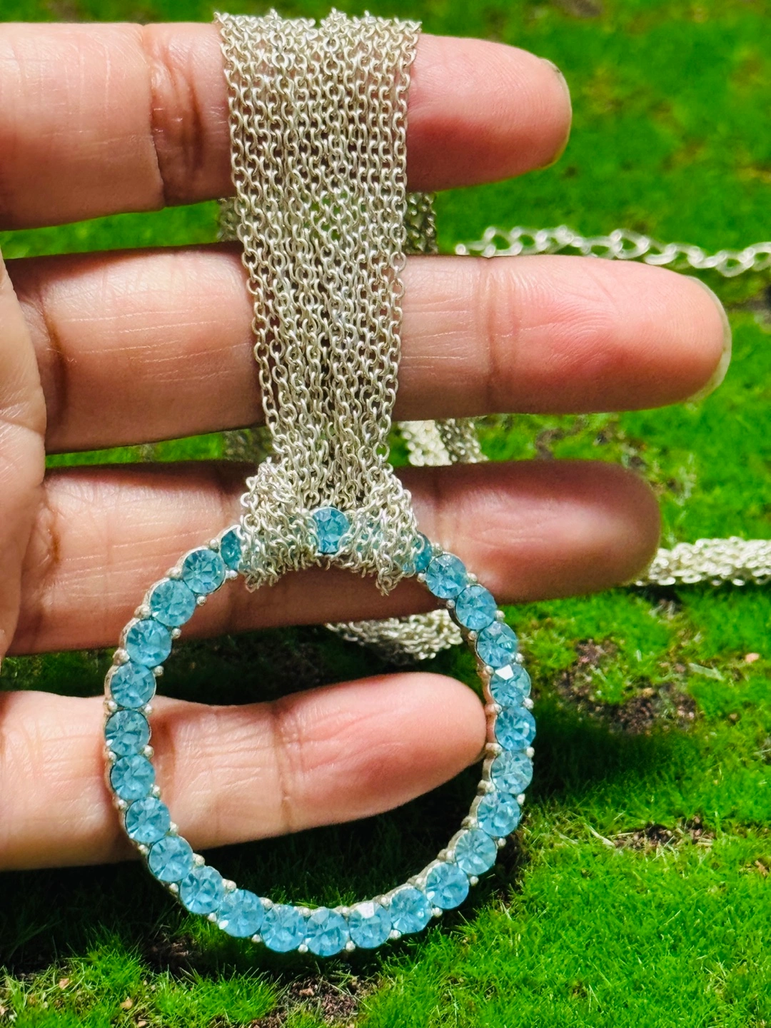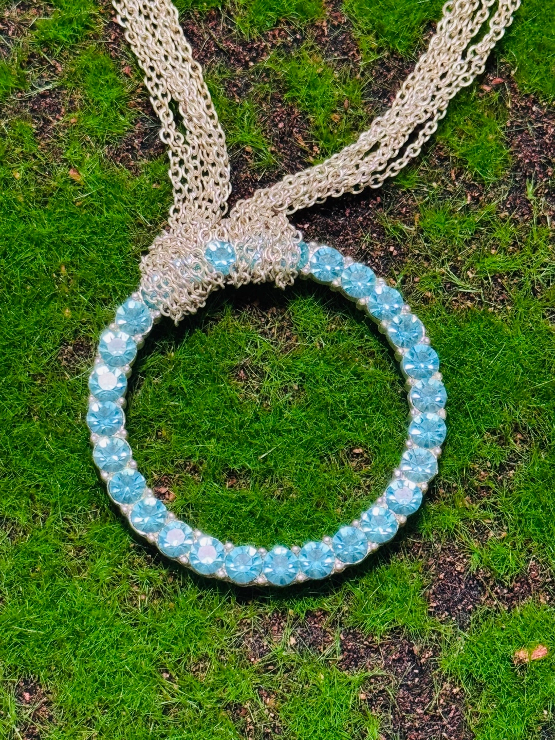 This is a beautiful pendant necklace! It features a silver chain with a circular pendant adorned with blue rhinestones. A lovely accessory to add a touch of sparkle to any outfit