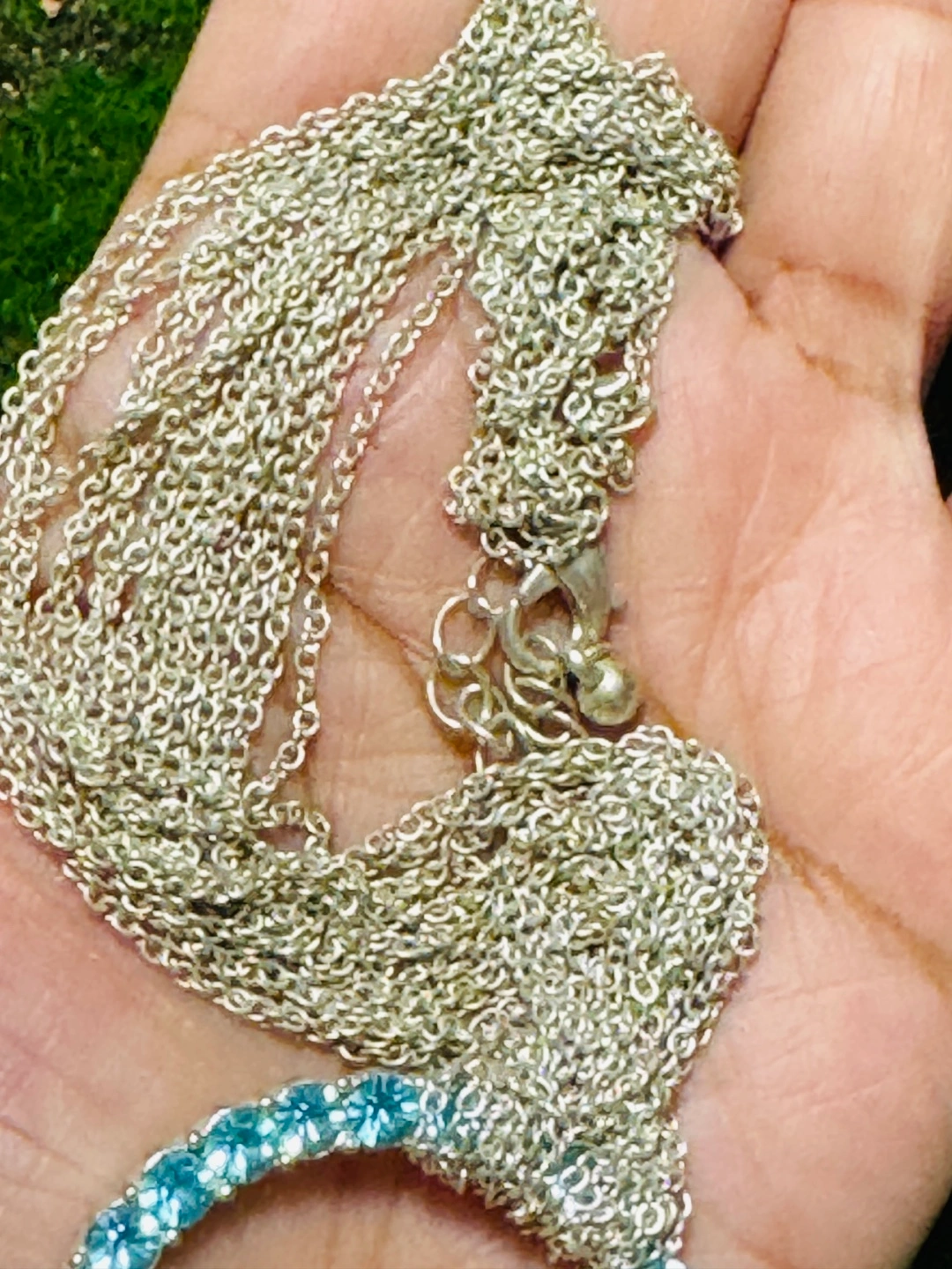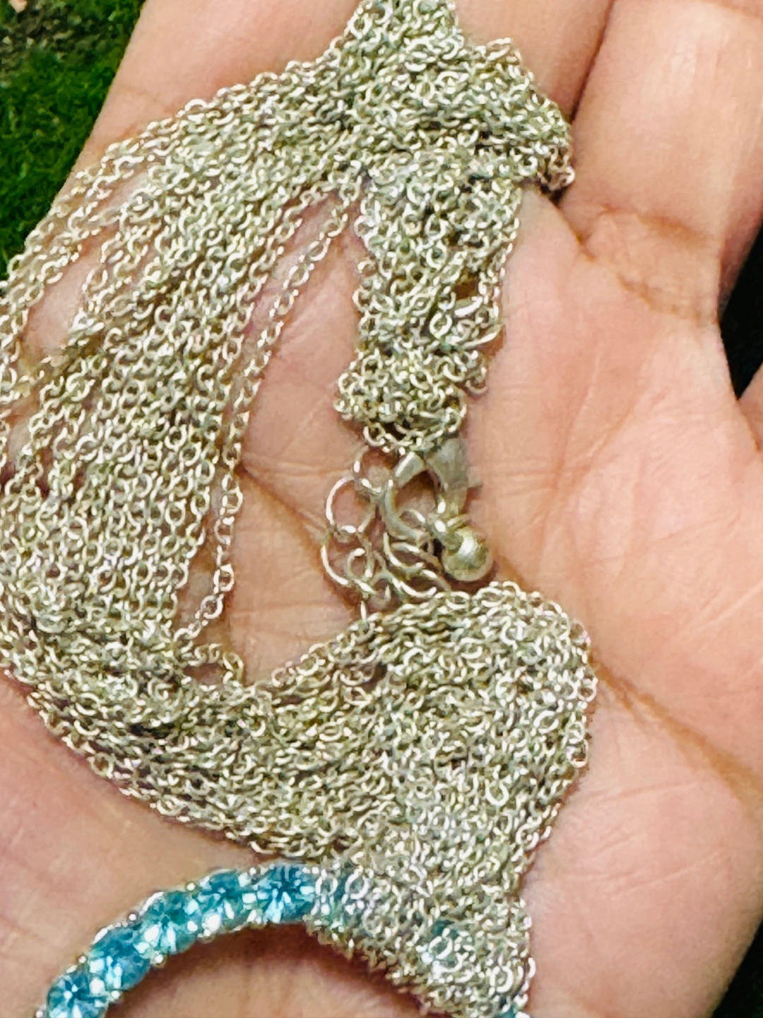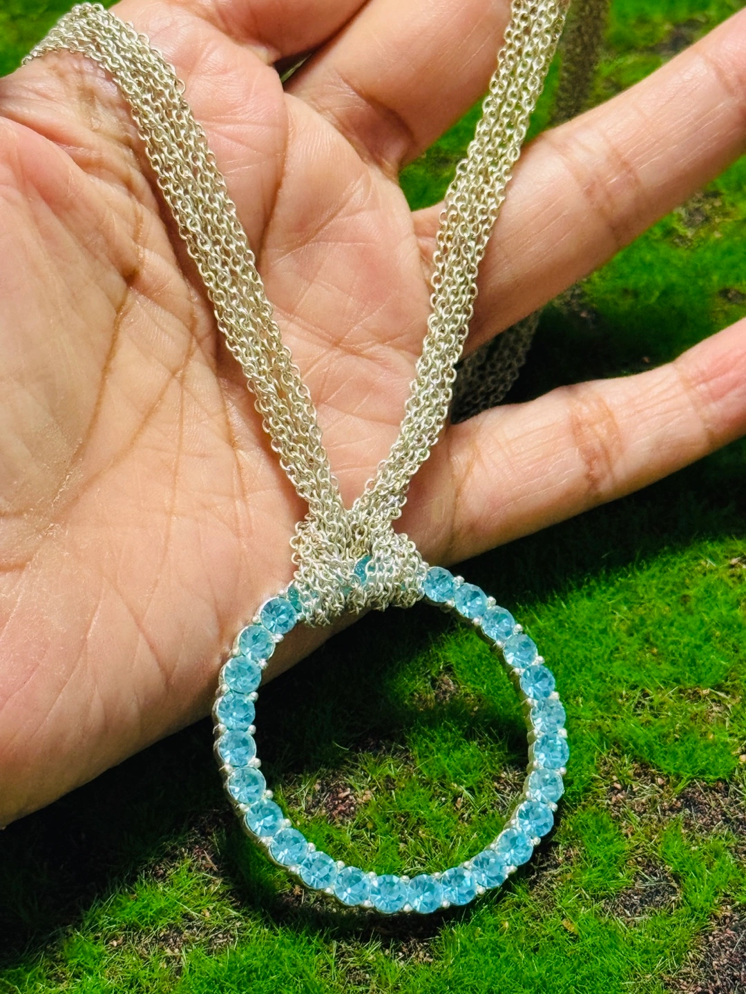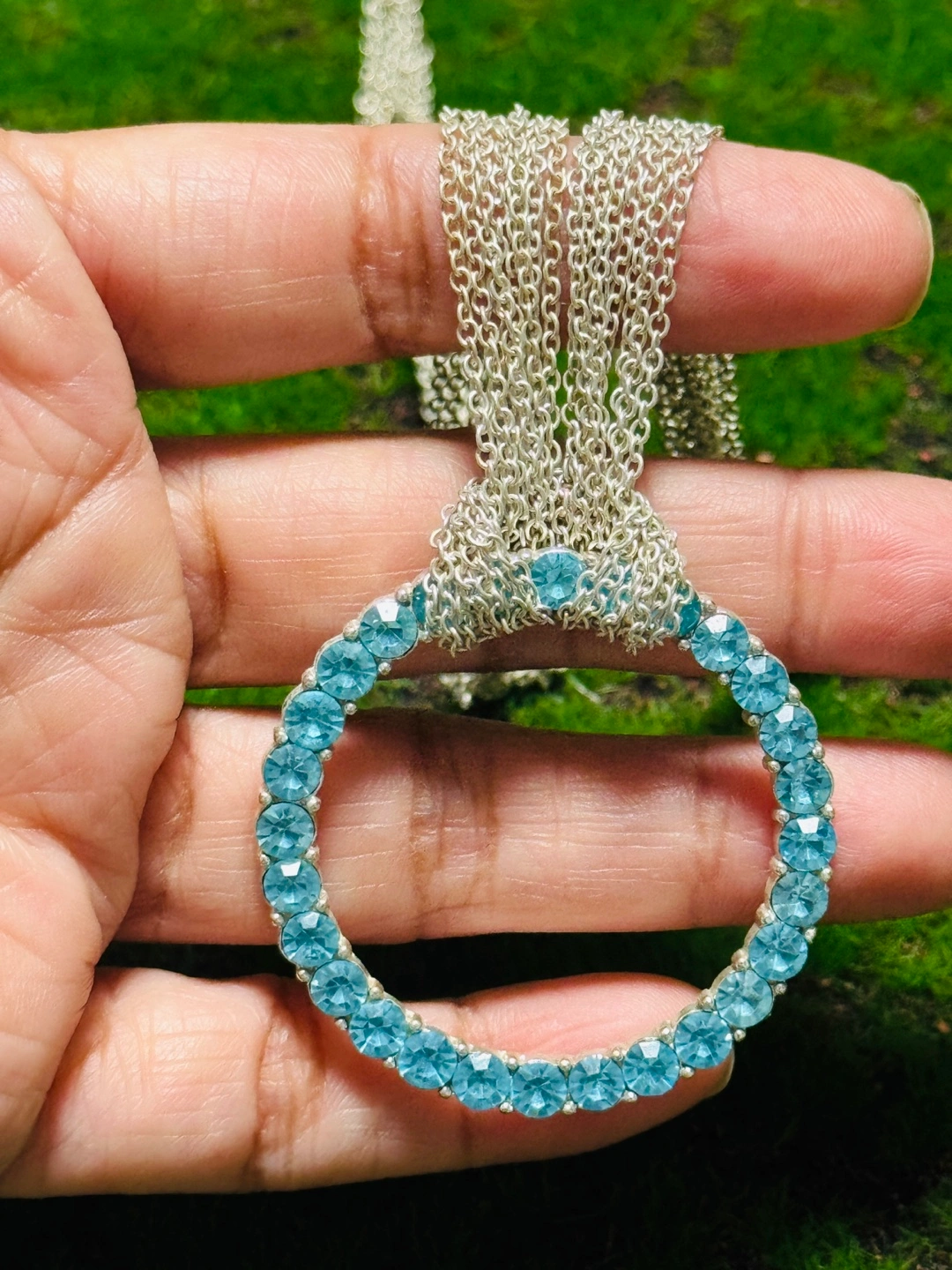 This is a beautiful pendant necklace! It features a silver chain with a circular pendant adorned with blue rhinestones. A lovely accessory to add a touch of sparkle to any outfit