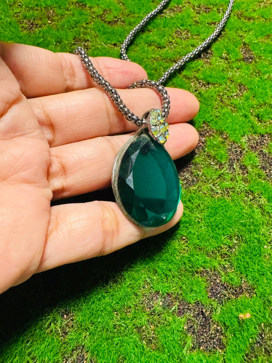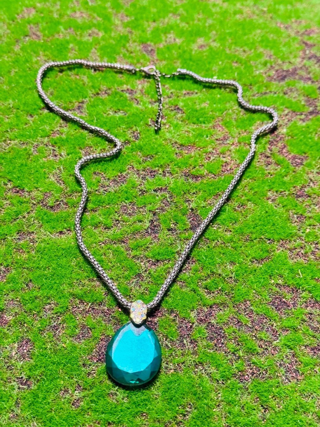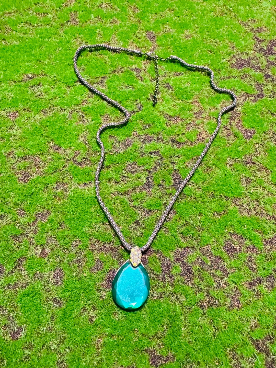 Selling a beautiful necklace with a teardrop-shaped green stone pendant! The chain is a silver color and has an adjustable clasp. The pendant has a decorative jewel embellishment at the top, adding a touch of sparkle. It's in great condition and ready to add some style to your outfits