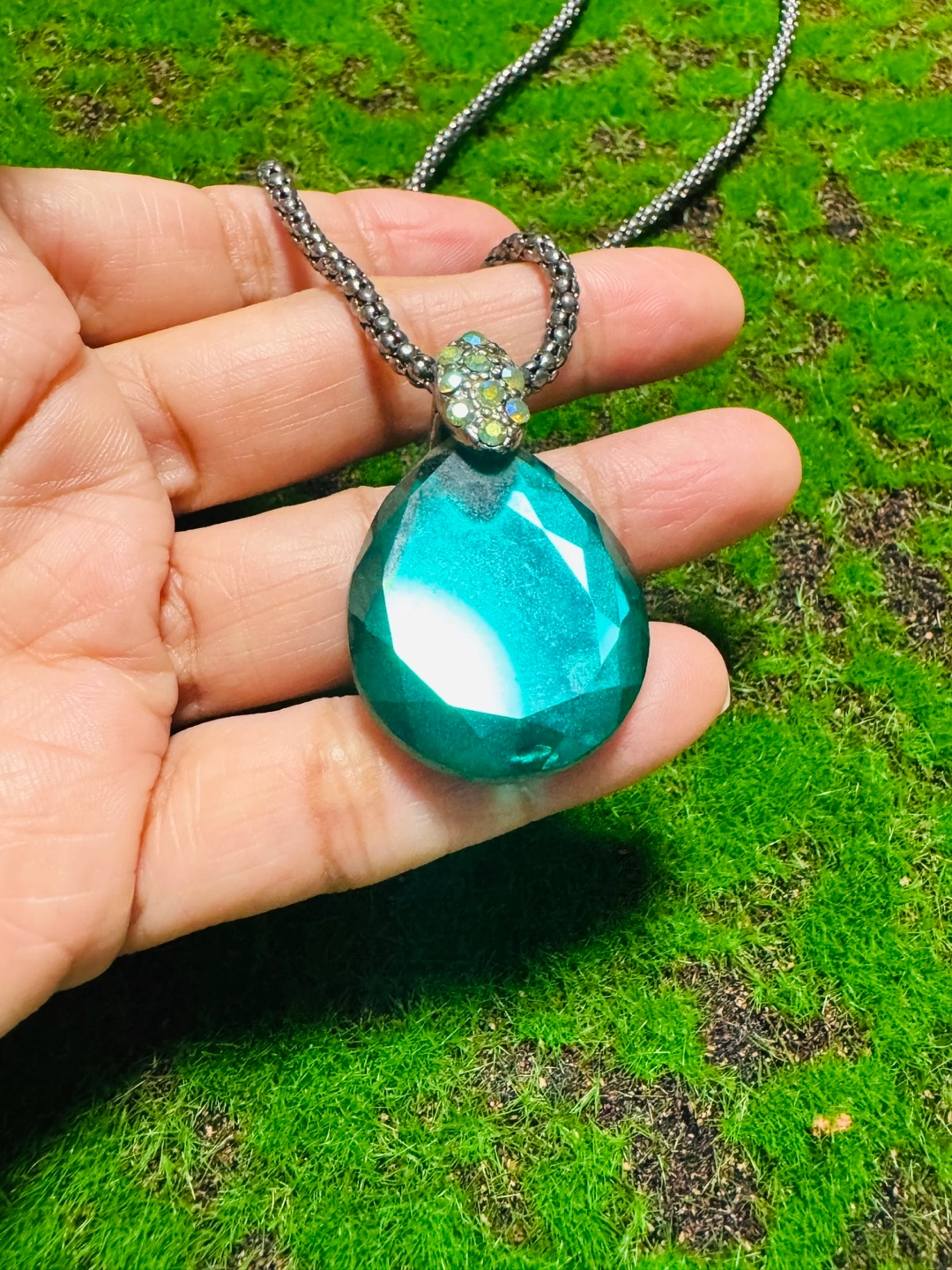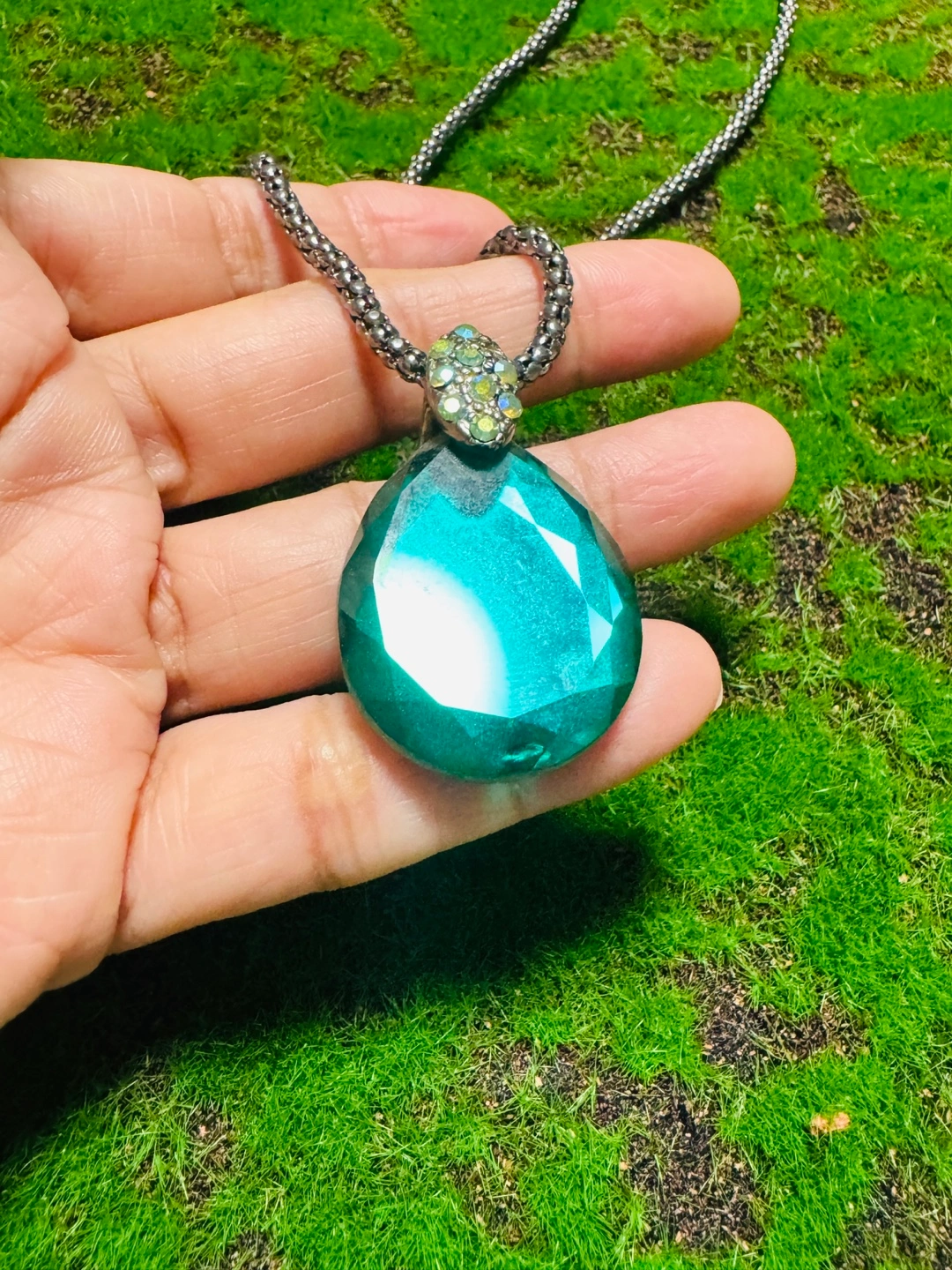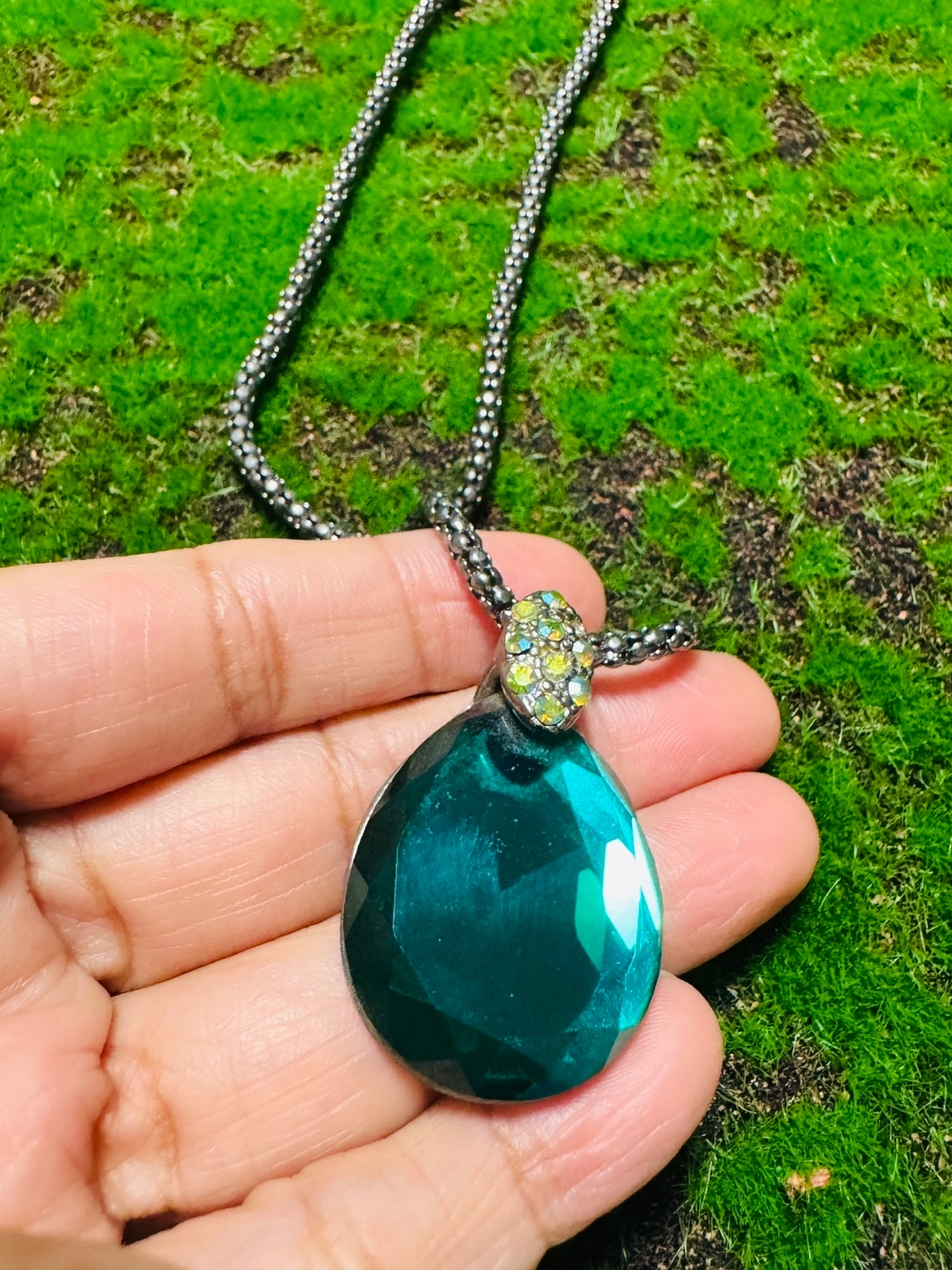 Selling a beautiful necklace with a teardrop-shaped green stone pendant! The chain is a silver color and has an adjustable clasp. The pendant has a decorative jewel embellishment at the top, adding a touch of sparkle. It's in great condition and ready to add some style to your outfits