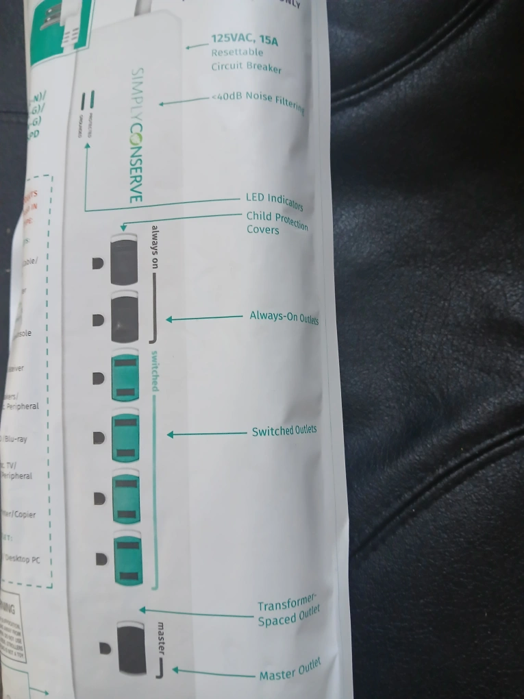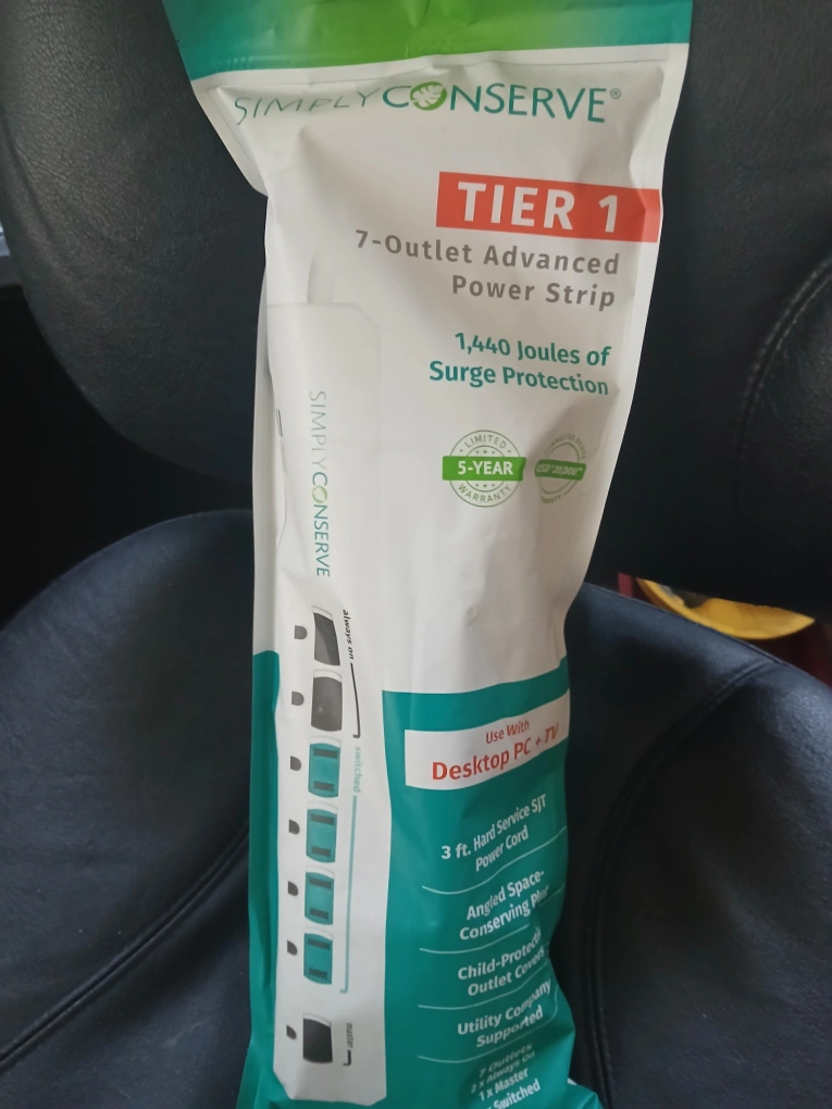 130Selling a Simply Conserve Tier 1, 7-Outlet Advanced Power Strip. It provides 1,440 joules of surge protection. - Designed with a 3 ft Hard Service SJT Power Cord - Angled Space-Conserving Plug - Child-Protective Outlet Covers - Utility Company Supported