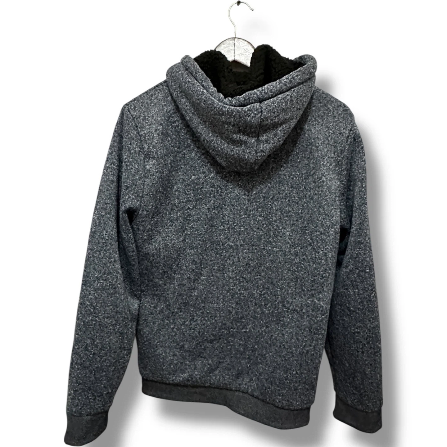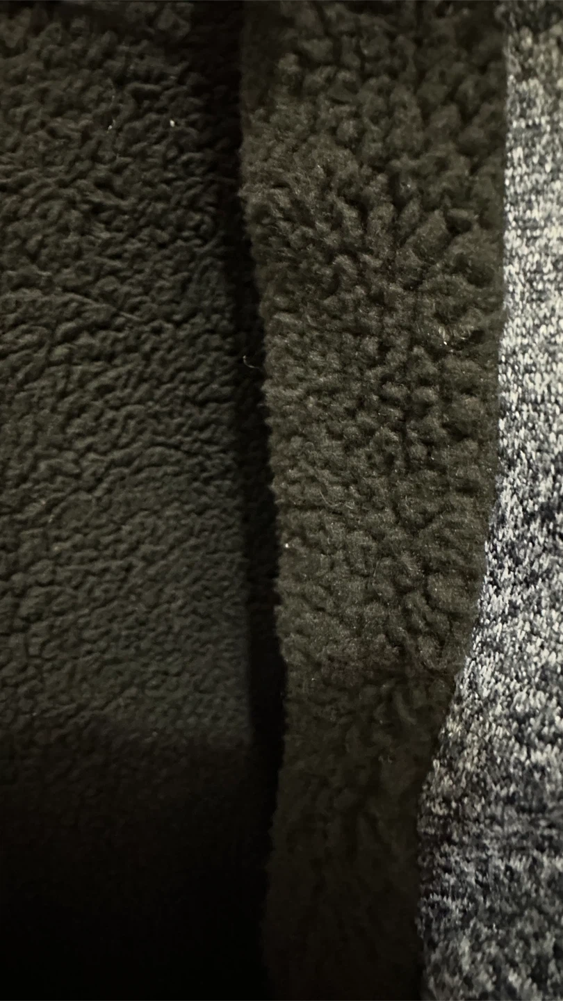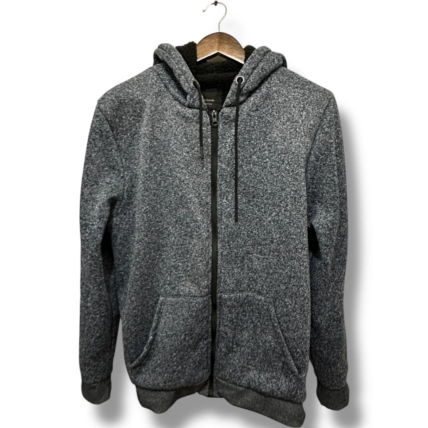 Six Lincoln New York hoodie with a cozy sherpa lining • Condition: Pre-owned, gently used. No rips or holes. Zipper works perfectly. Clean and ready to wear. • Size: M • Color: Dark Heather Gray, Blue (outer) with Black Sherpa Lining (inner) • Material: Knit shell with fleece lining (very warm) • Made in China • Manufacturing Date: September 2020