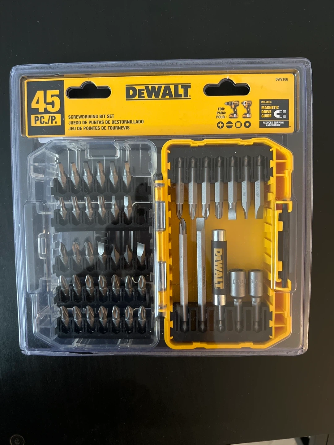 Selling a brand new DeWalt 45-piece screwdriving bit set! It includes a magnetic drive guide and comes in a tough case connectable case system. This set is perfect for various screwdriving needs and keeps everything organized in its case