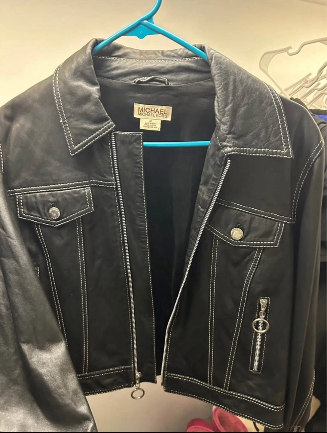 Selling a stylish black leather jacket from Michael Kors! It's in great condition and features a sleek design with white stitching accents. Perfect for adding a touch of edge to any outfit