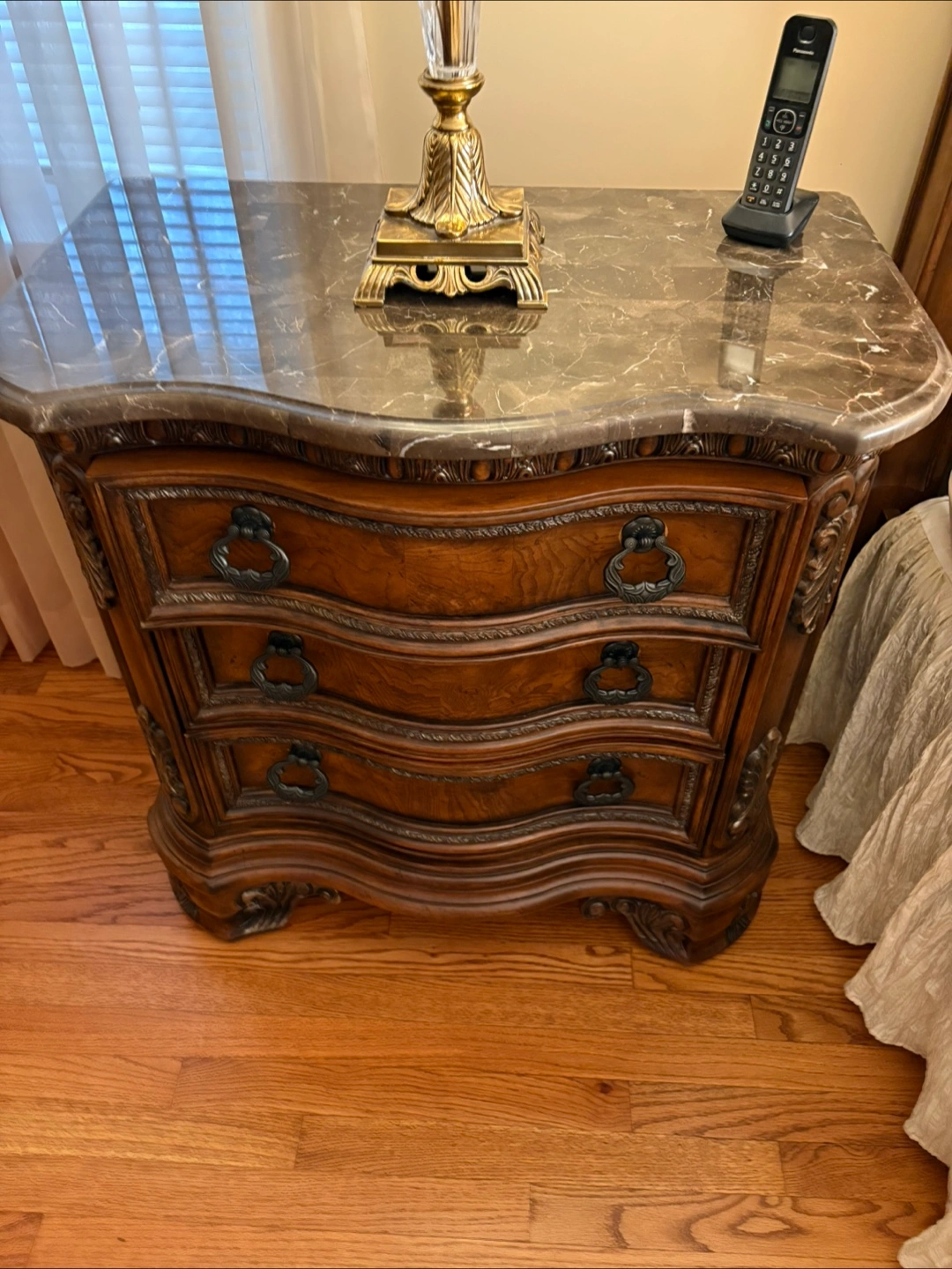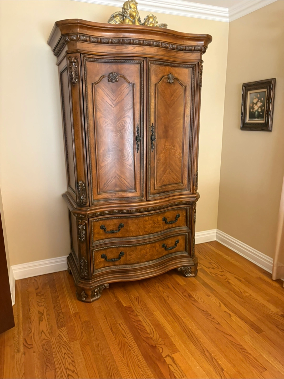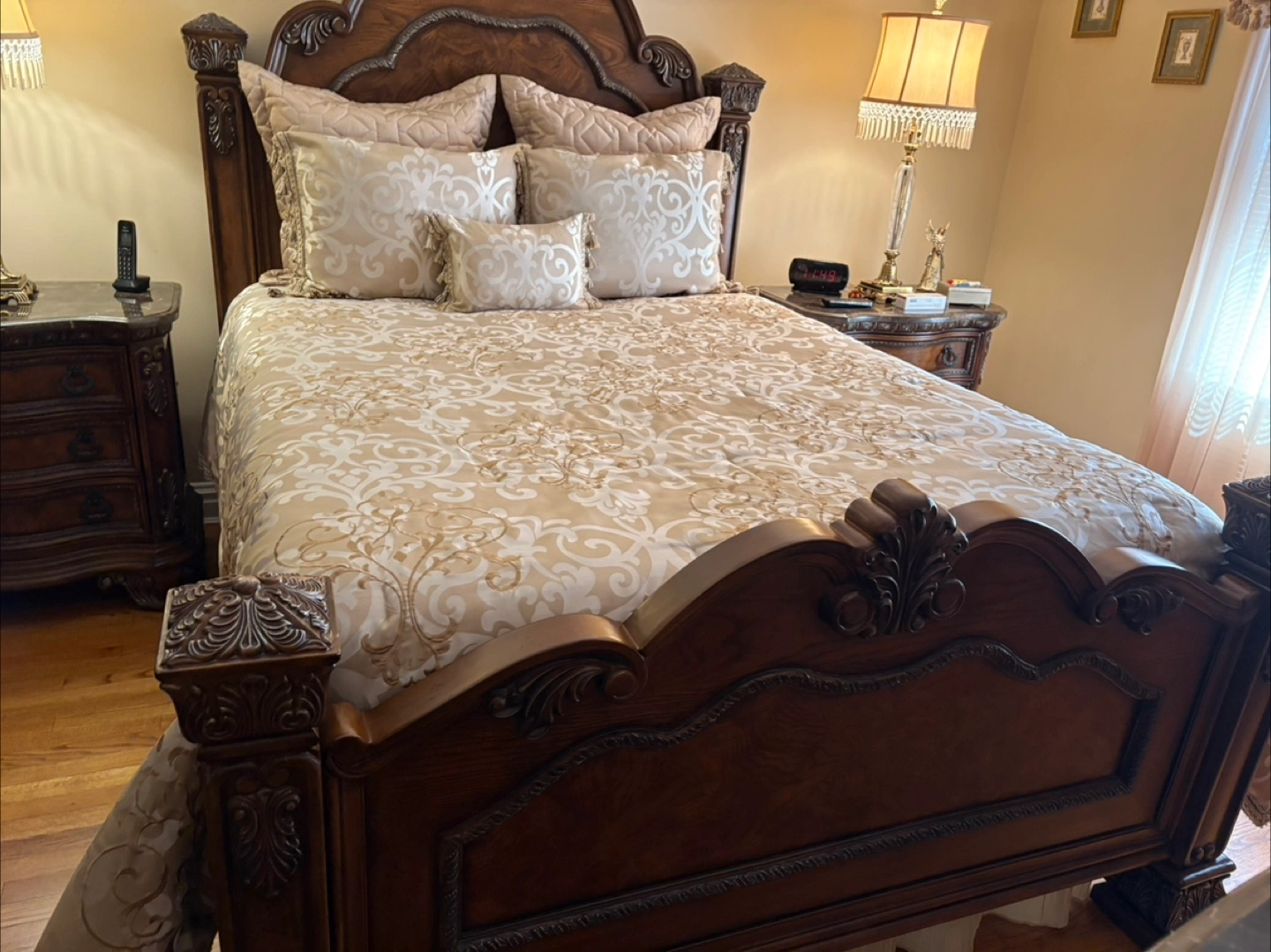 10Selling an ornate wood queen size bedroom set. It includes a dresser with a mirror, a bed, two nightstands and an armoire. The set has a beautiful, detailed design with marble tops.