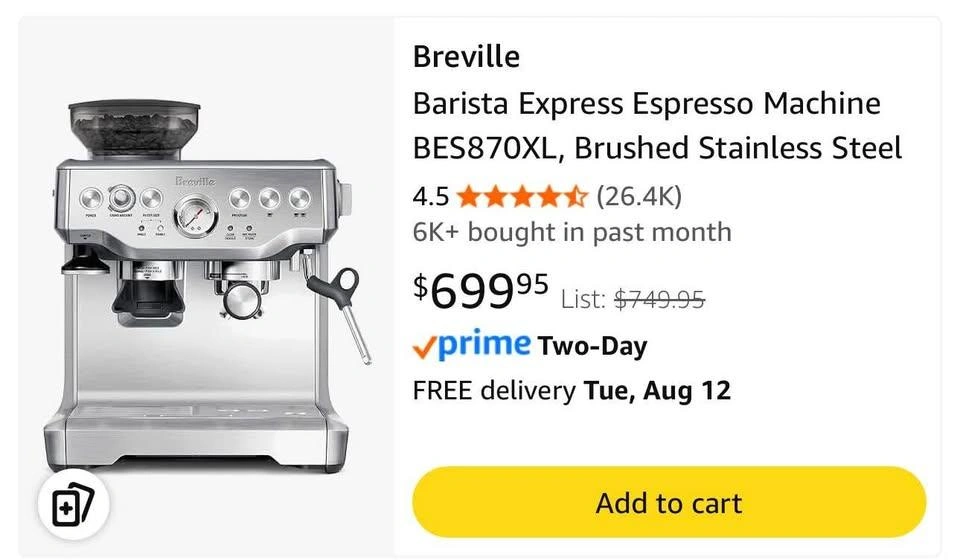 65Available, firm price! Breville Barista Express Espresso Machine BES870BSXL - New! Retail price 700$ + tax Pick up in Chicago, Uptown. Willing to ship. —- The Breville Barista Express delivers third wave specialty coffee at home using the 4 keys formula and is part of the Barista Series that offers all in one espresso machines with integrated grinder to go from beans to espresso in under one minute DOSE CONTROL GRINDING: Integrated precision conical burr grinder grinds on demand to deliver the right amount of freshly ground coffee directly into the portafilter for your preferred taste with any roast of bean OPTIMAL WATER PRESSURE: Low pressure pre-infusion gradually increases pressure at the start and helps ensure all the flavors are drawn out evenly during the extraction for a balanced tasting cup PRECISE ESPRESSO EXTRACTION: Digital temperature control (PID) delivers water at precisely the right temperature, ensuring optimal espresso extraction MANUAL MICROFOAM MILK TEXTURING: The powerful steam wand performance allows you to hand texture microfoam milk that enhances flavor and enables creation of latte art ESPRESSO MACHINE WITH GRIND SIZE DIAL: Simple and intuitive, giving you control over the grind size no matter what type of bean you're grinding ESPRESSO MAKER WITH BUILT-IN COFFEE GRINDER: Innovative grinding cradle allows any at home barista to grind directly into the espresso portafilter for the perfect espresso INCLUDED: Razor Dose Trimming Tool, 54mm Stainless Steel Portafilter, 1 & 2 cup Single & Dual Wall Filter Baskets, Coffee Scoop, Integrated Tamper, Stainless Steel Milk Jug, Cleaning Disc, Tablets, Brush Tool, Allen Key, Water Filter & Filter Holder CAPACITY & SETTINGS: 1/2 lb Bean Hopper; 67 oz Water Tank; Single or double shots; Adjustable Grind Amount and Manual Override