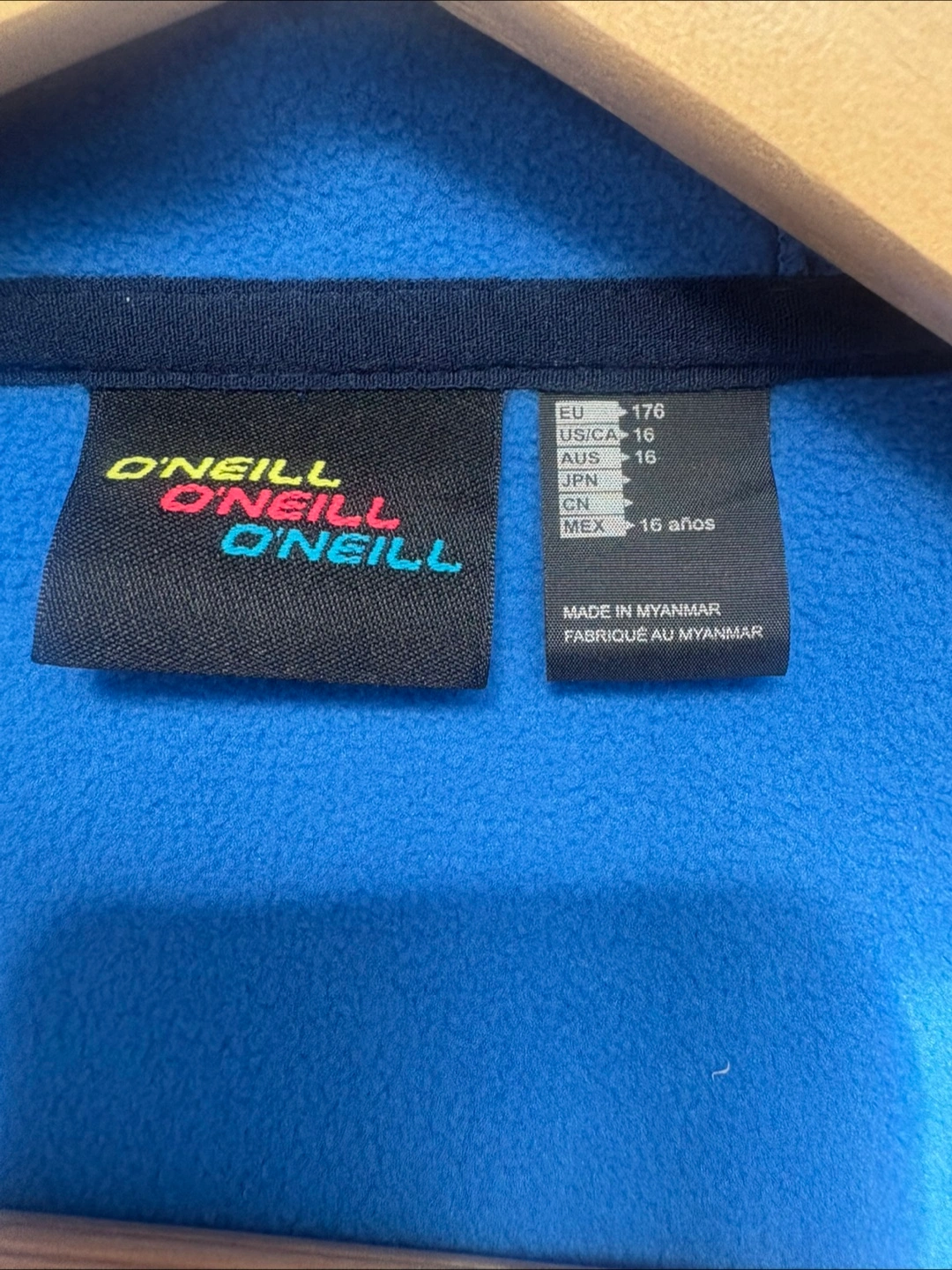 23O'Neill hoodie in size US/CA 16. It's a stylish and comfortable piece, perfect for layering or wearing on its own. The hoodie features a full zip front and a hood for added warmth and protection. The color is a nice blue, and the material feels soft and cozy. New with tags.
