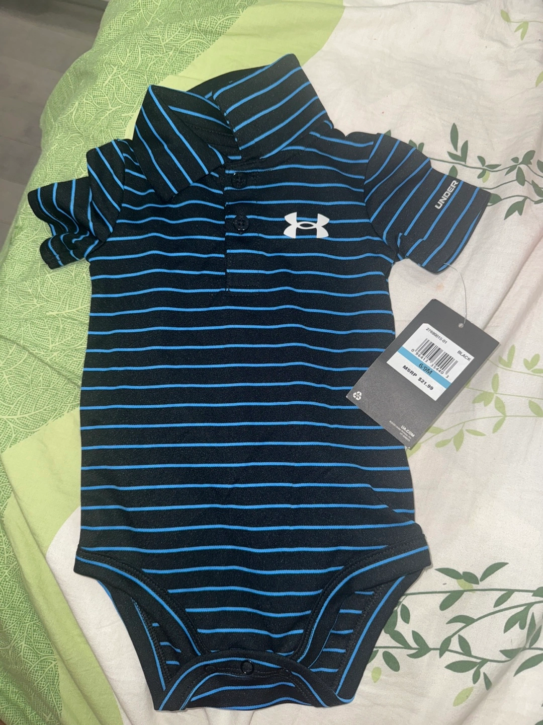 This Under Armour baby bodysuit is in excellent condition and ready for a new home! It features a stylish striped design in black and blue. Size is 6-9 months. The original price was $21.99
