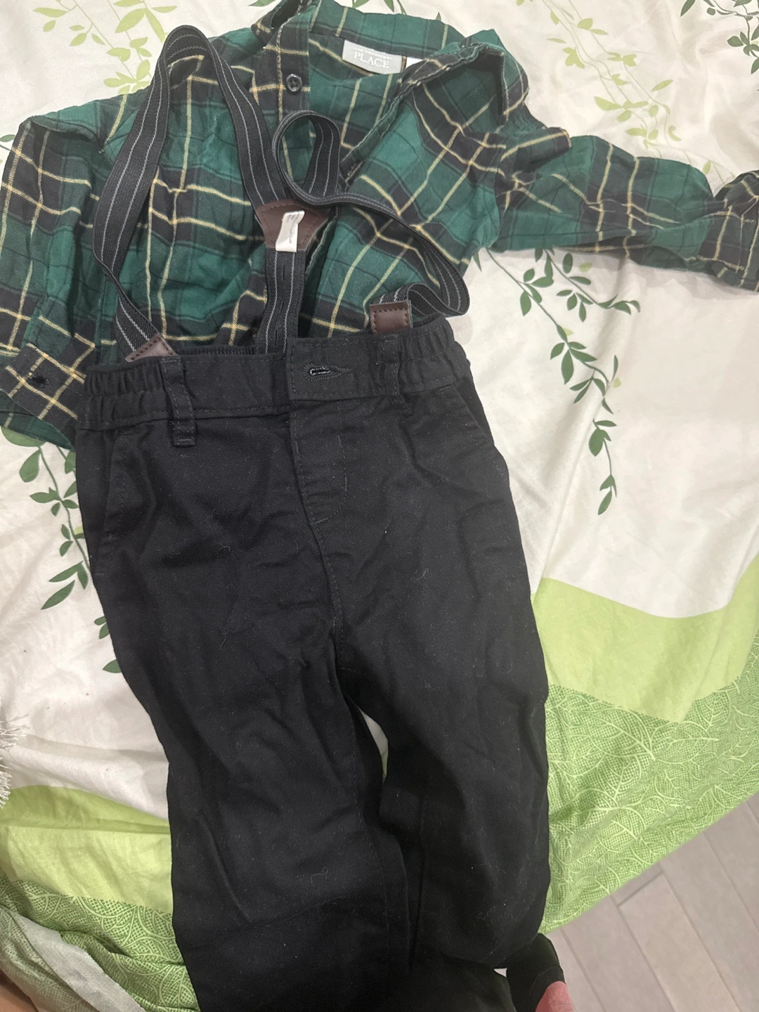 Selling a cute outfit from The Children's Place! It includes a green and black plaid shirt and black pants with suspenders. Perfect for your little one!