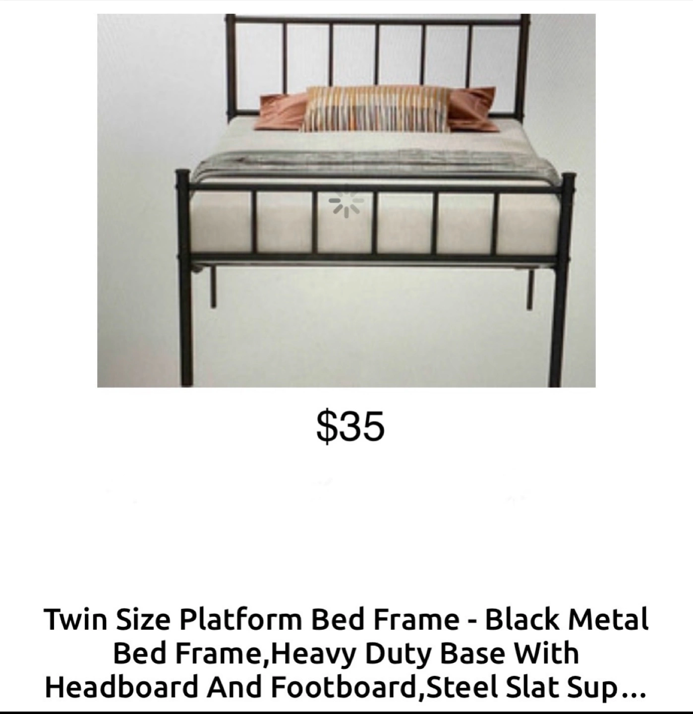 Buy & SellTwin Size Black Metal Platform Bed FrameTwin Size Black Metal Platform Bed Frame$35Selling a twin size platform bed frame. It's a black metal bed frame with a heavy-duty base, headboard, and footboard. The frame also features steel slat supportWHERE TO MEETCheck LocationView MapSELLERverifiedCarlosLower West Side964 reviews6 chats·5 favorites·154 viewsSEND CHAT TO SELLERHi Carlos! I’m interested in your listing.Hi Carlos! I’m interested in your listing.Get the Karrot app to chatSign In to chat