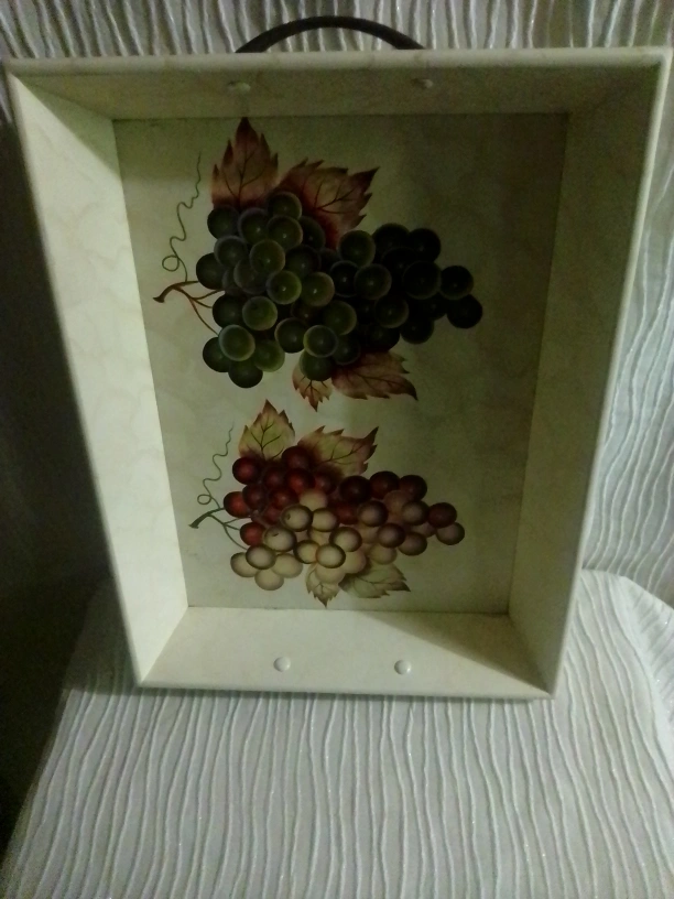 335Selling a decorative wooden tray featuring a grape design. It has a handle for easy carrying. The tray is in good condition and would be a nice addition to any home decor