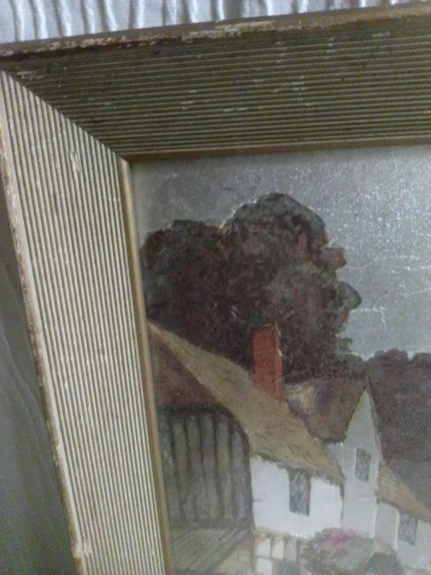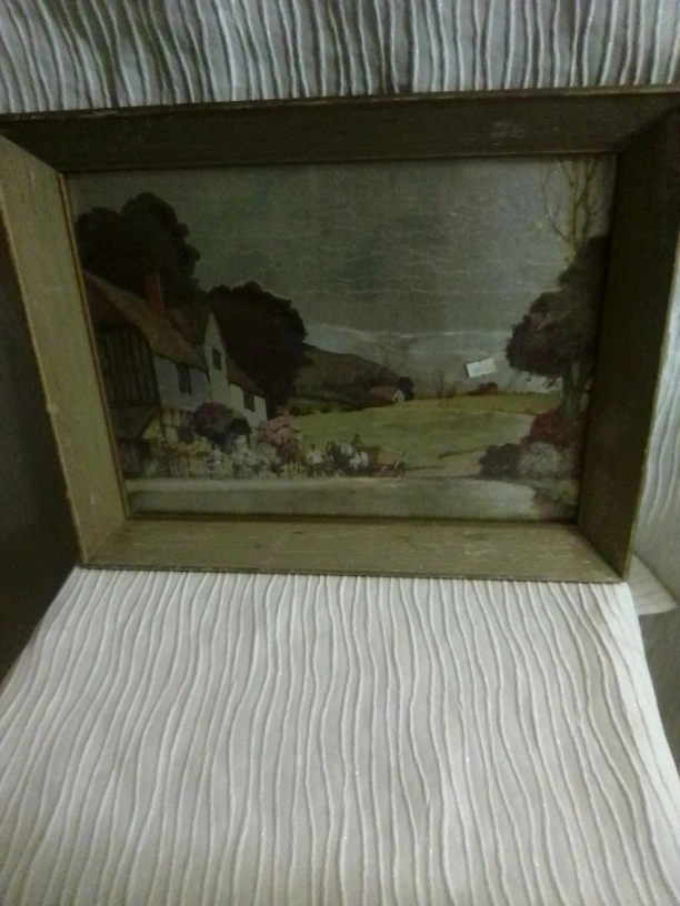 This is a charming vintage print of a cottage landscape, framed and ready to hang. It would add a touch of rustic charm to any room. 19x14x1