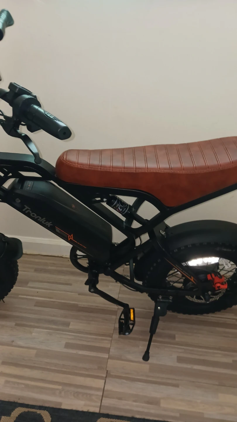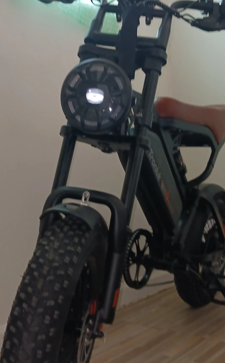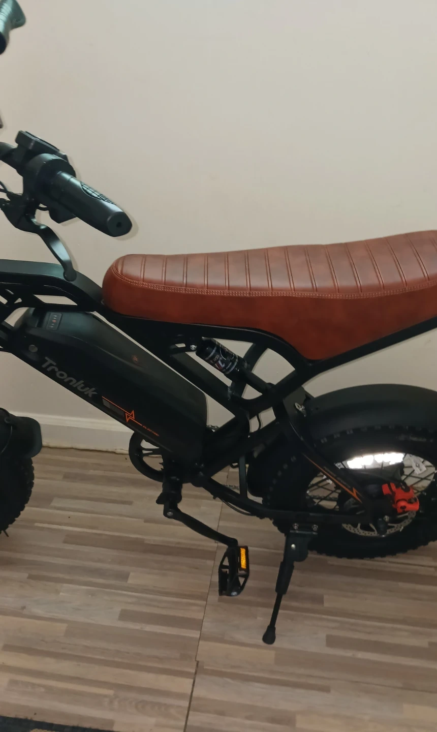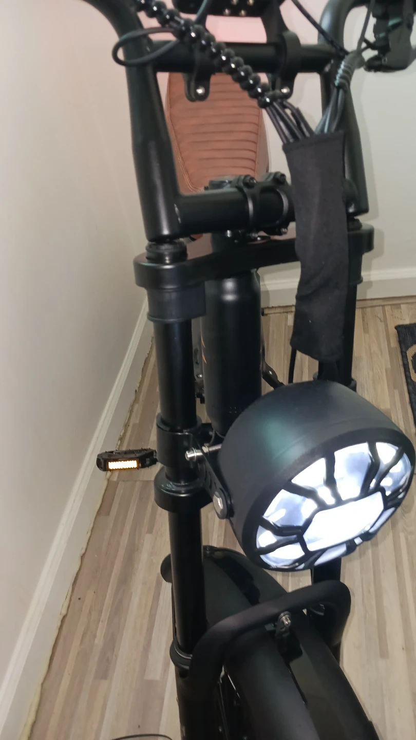 This is an electric fat tire bike with a black frame and a brown seat. It features a bright LED headlight and rugged tires for various terrains. Pedals are included for optional manual riding.