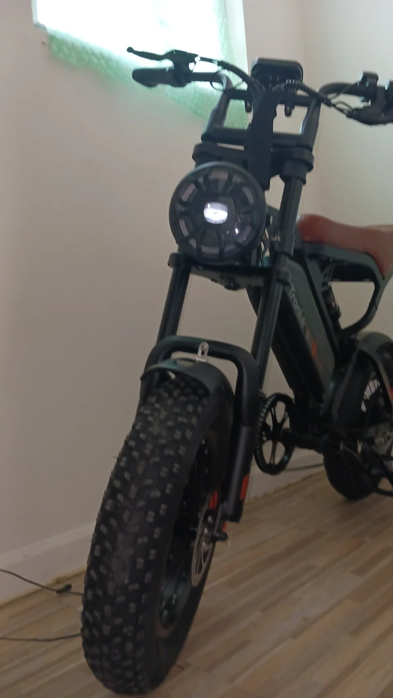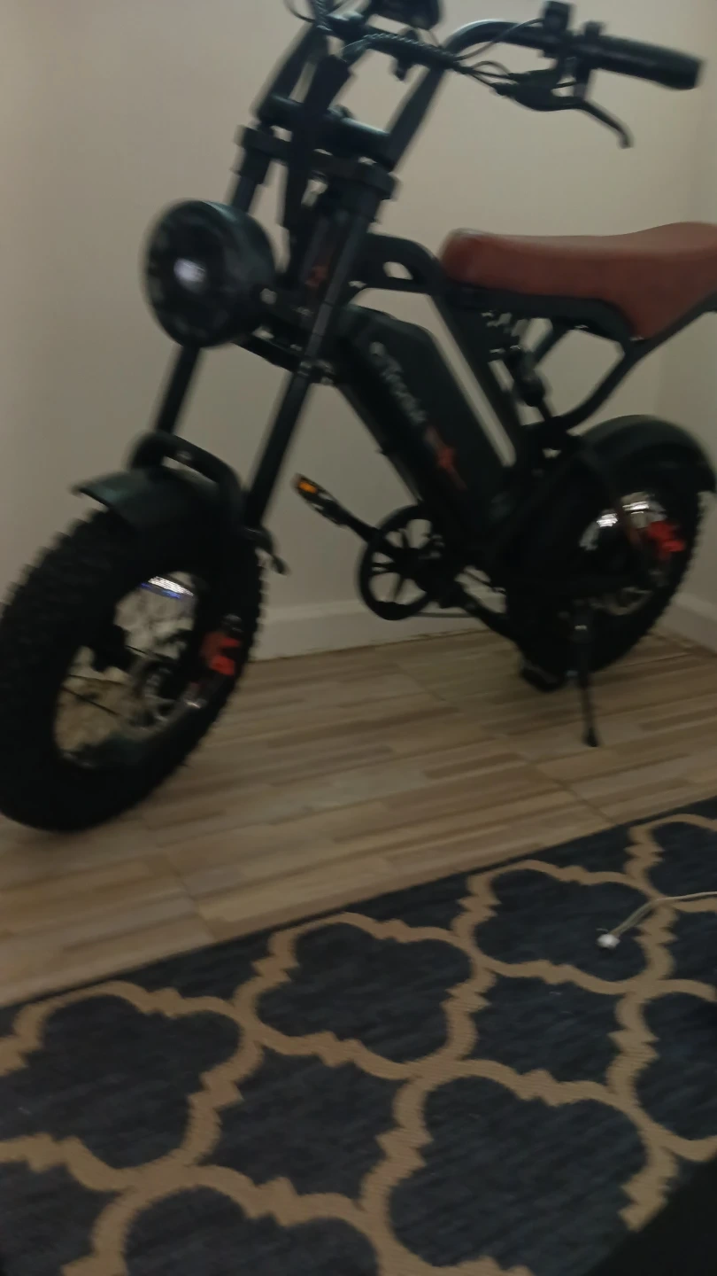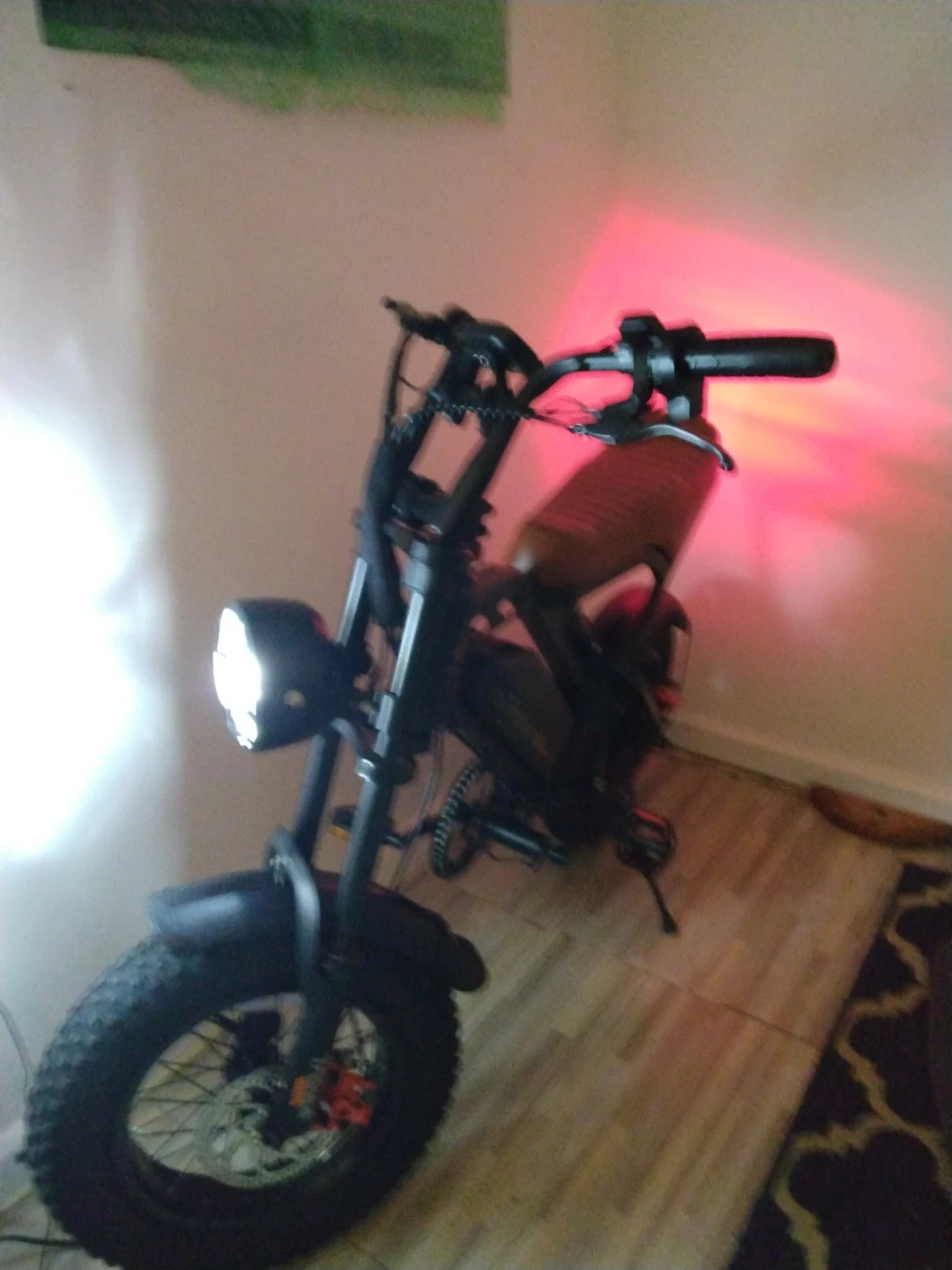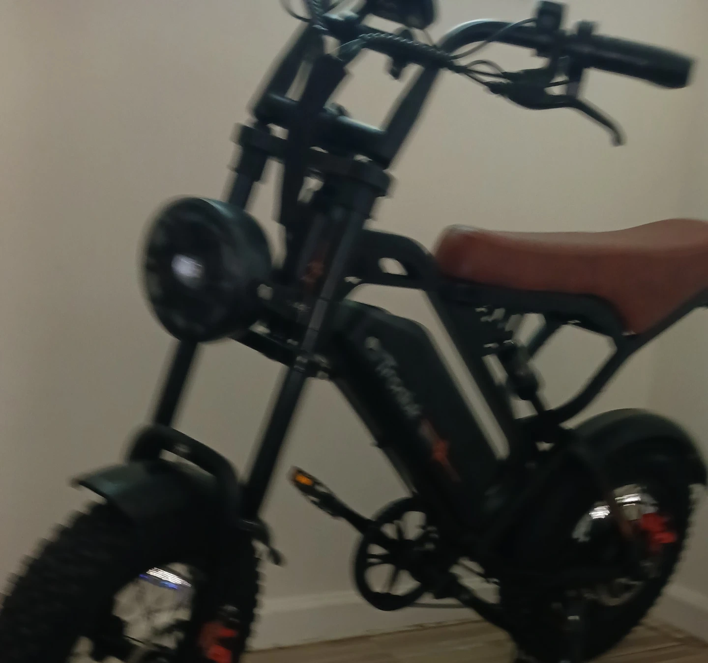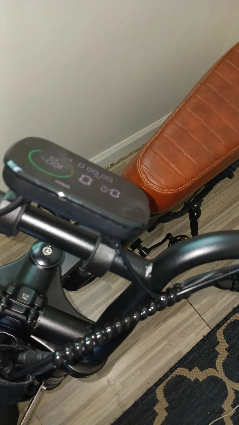 This is an electric fat tire bike with a black frame and a brown seat. It features a bright LED headlight and rugged tires for various terrains. Pedals are included for optional manual riding.