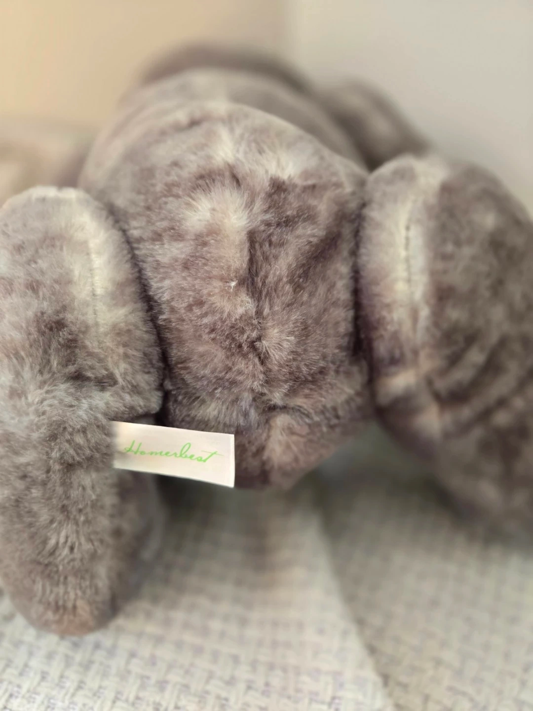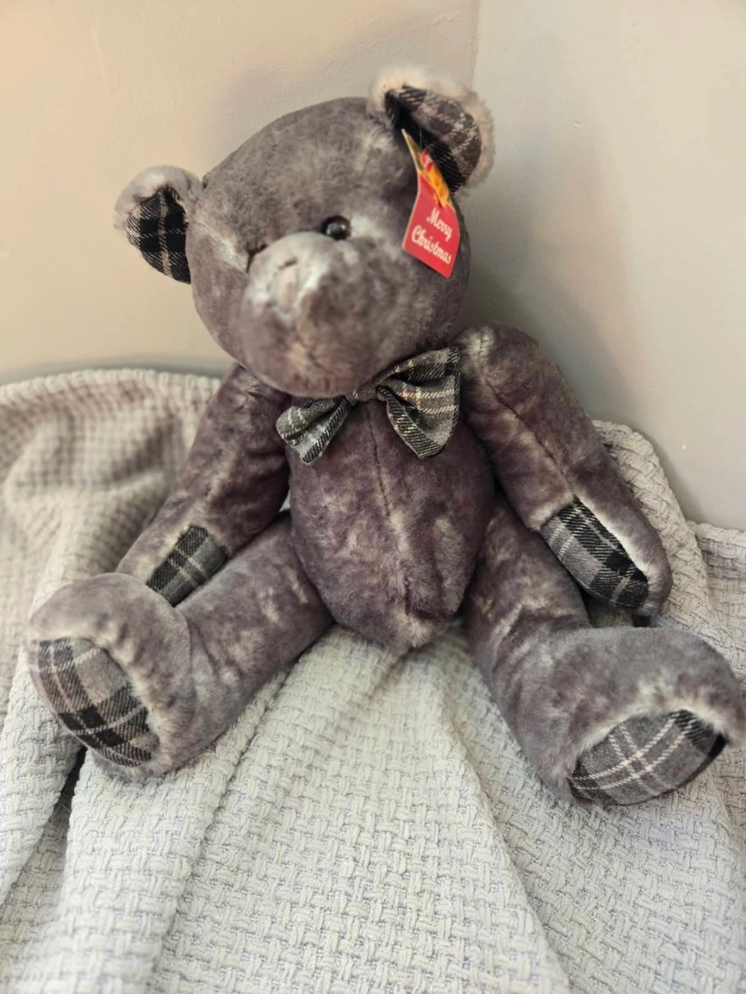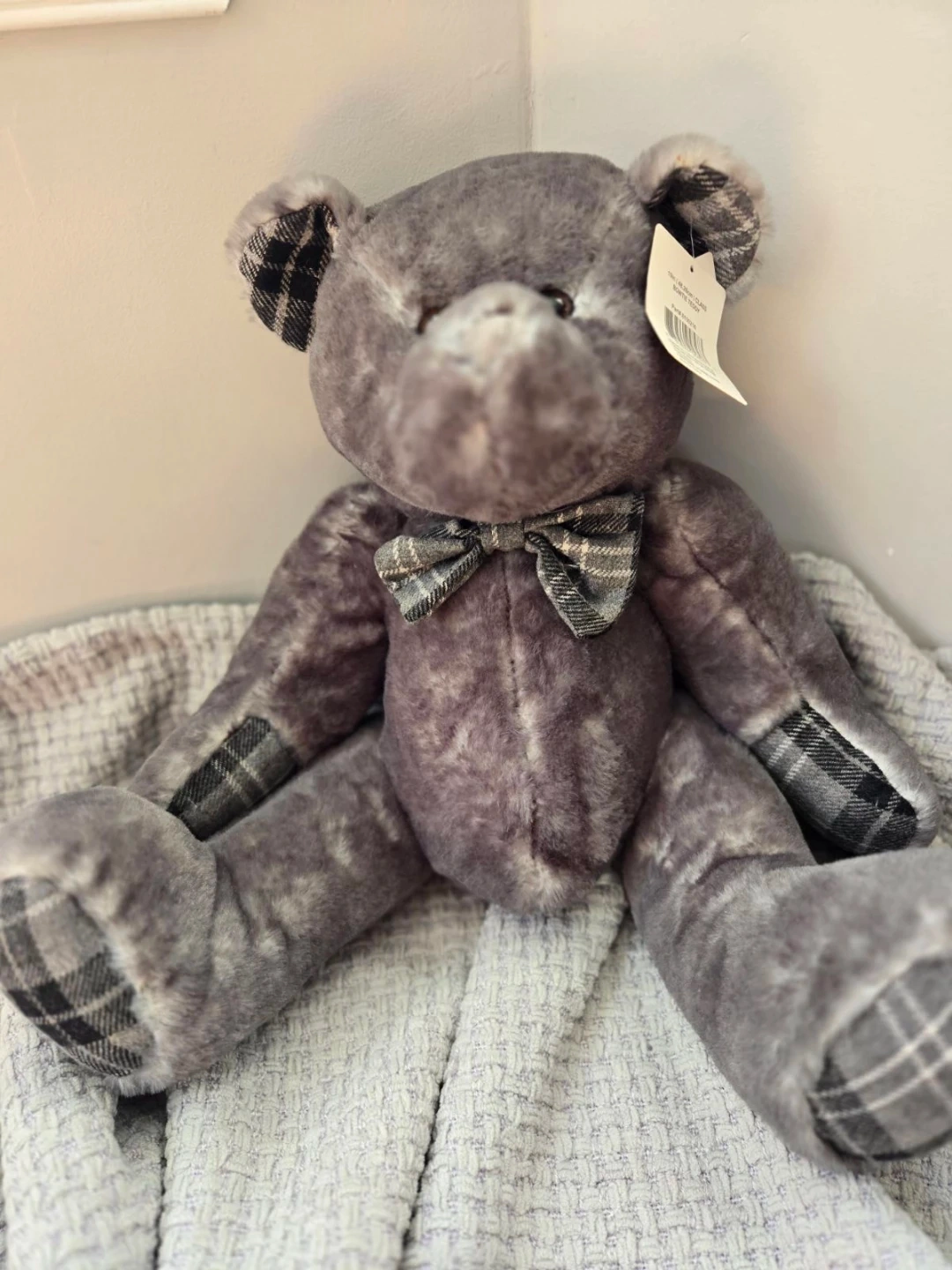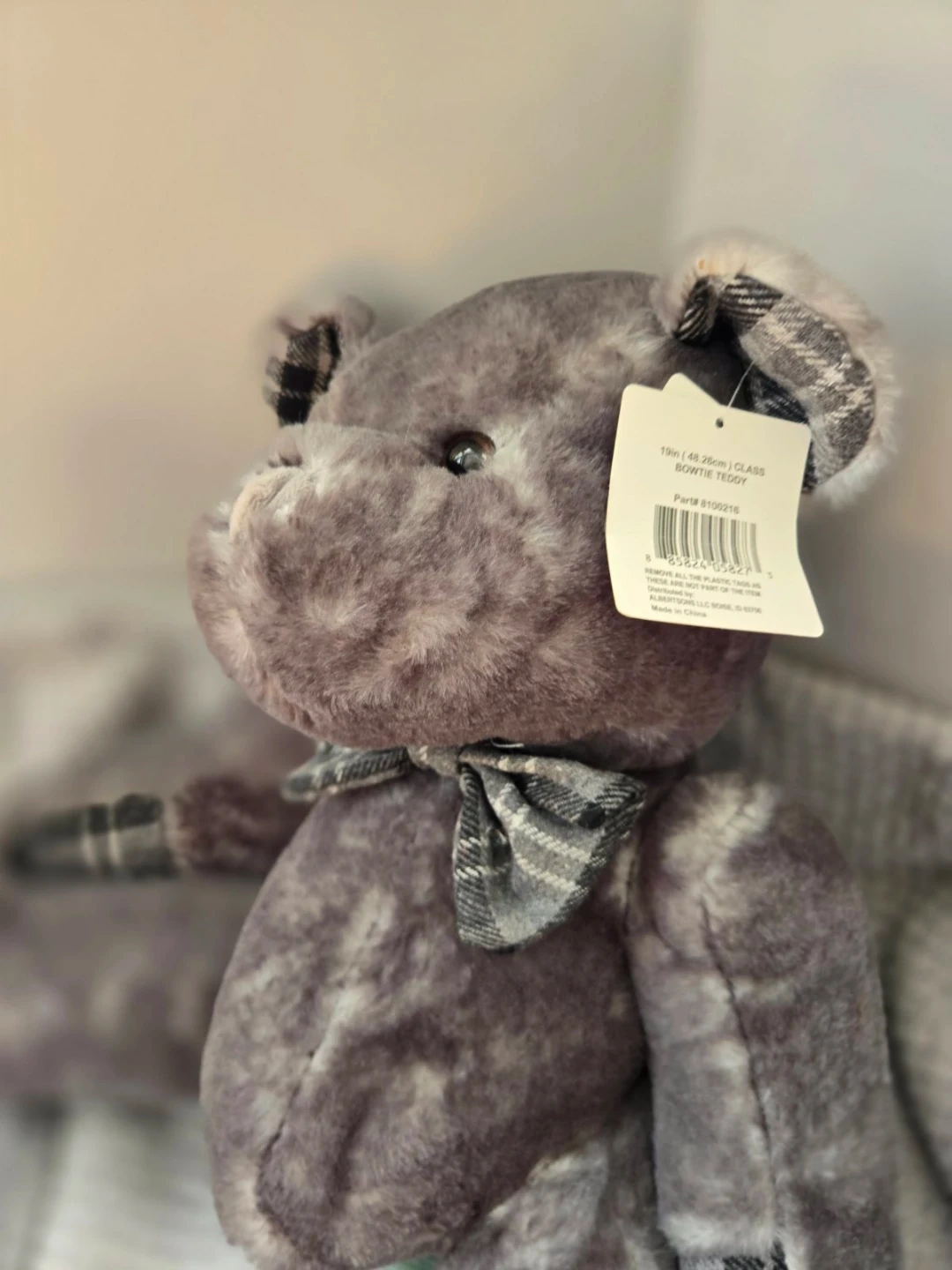 This is a 19-inch gray teddy bear from Homerbest. It's made with soft plush material and features a plaid bow tie and accent ears and paws. It's a charming decorative item or gift!