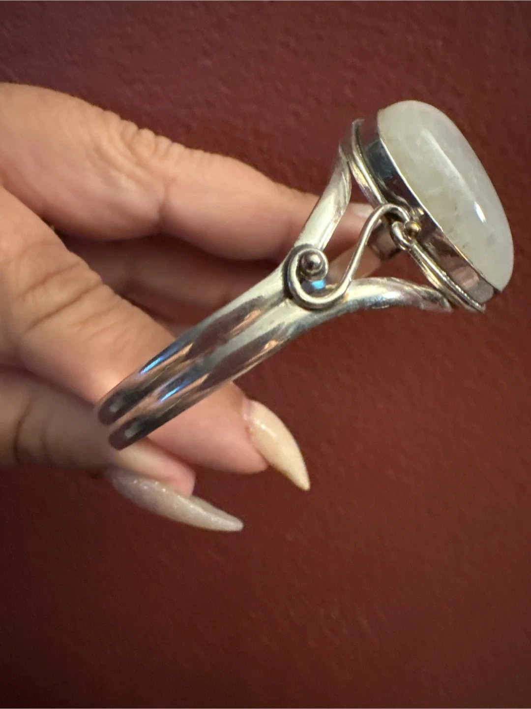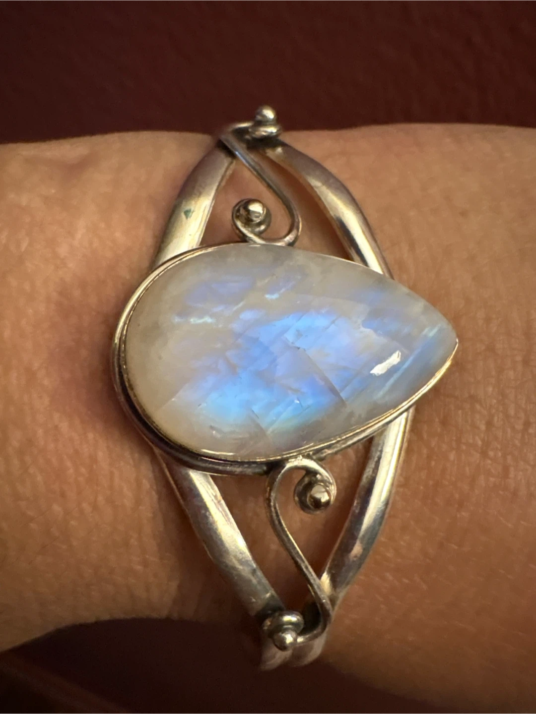 This cuff bracelet features a pear-shaped genuine moonstone set in β925 silver. It's stamped with '925' indicating sterling silver. This piece adds a unique touch to any jewelry collection.