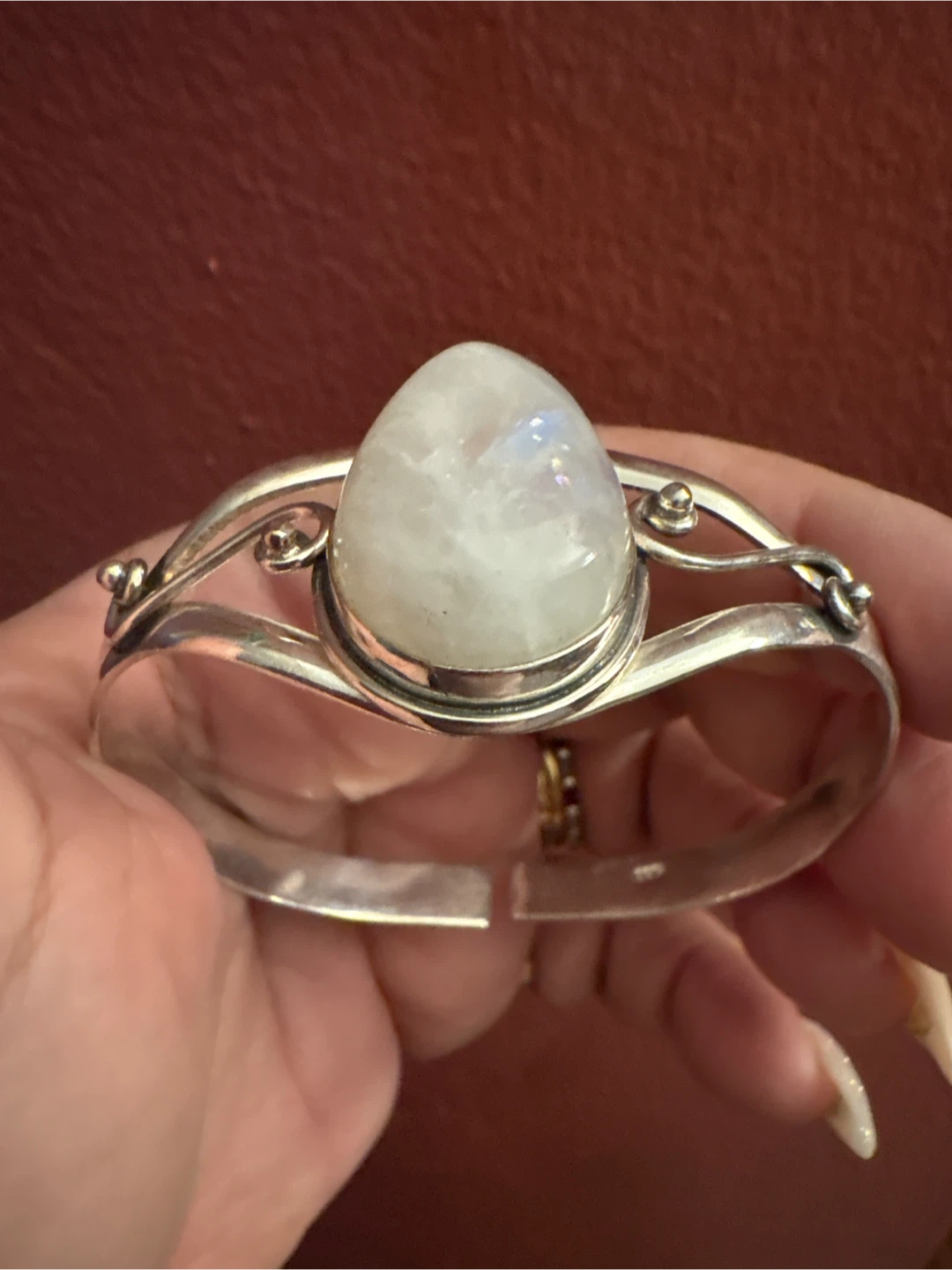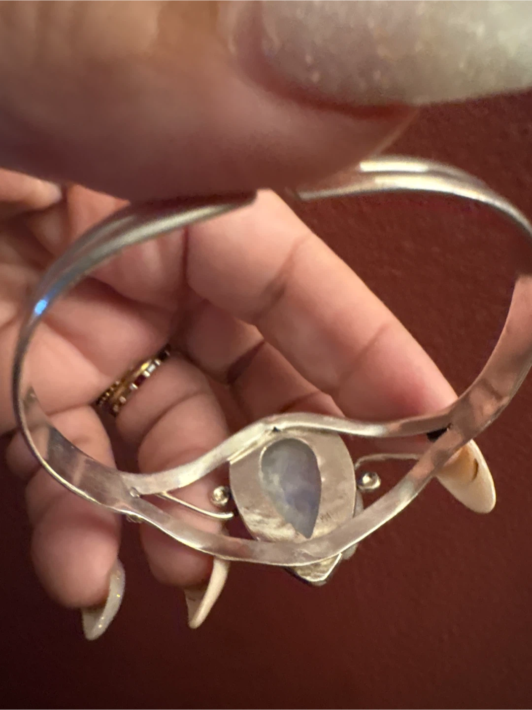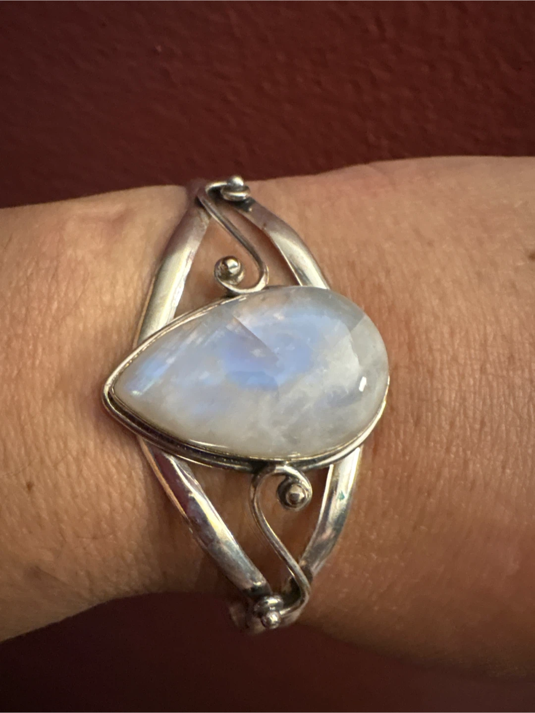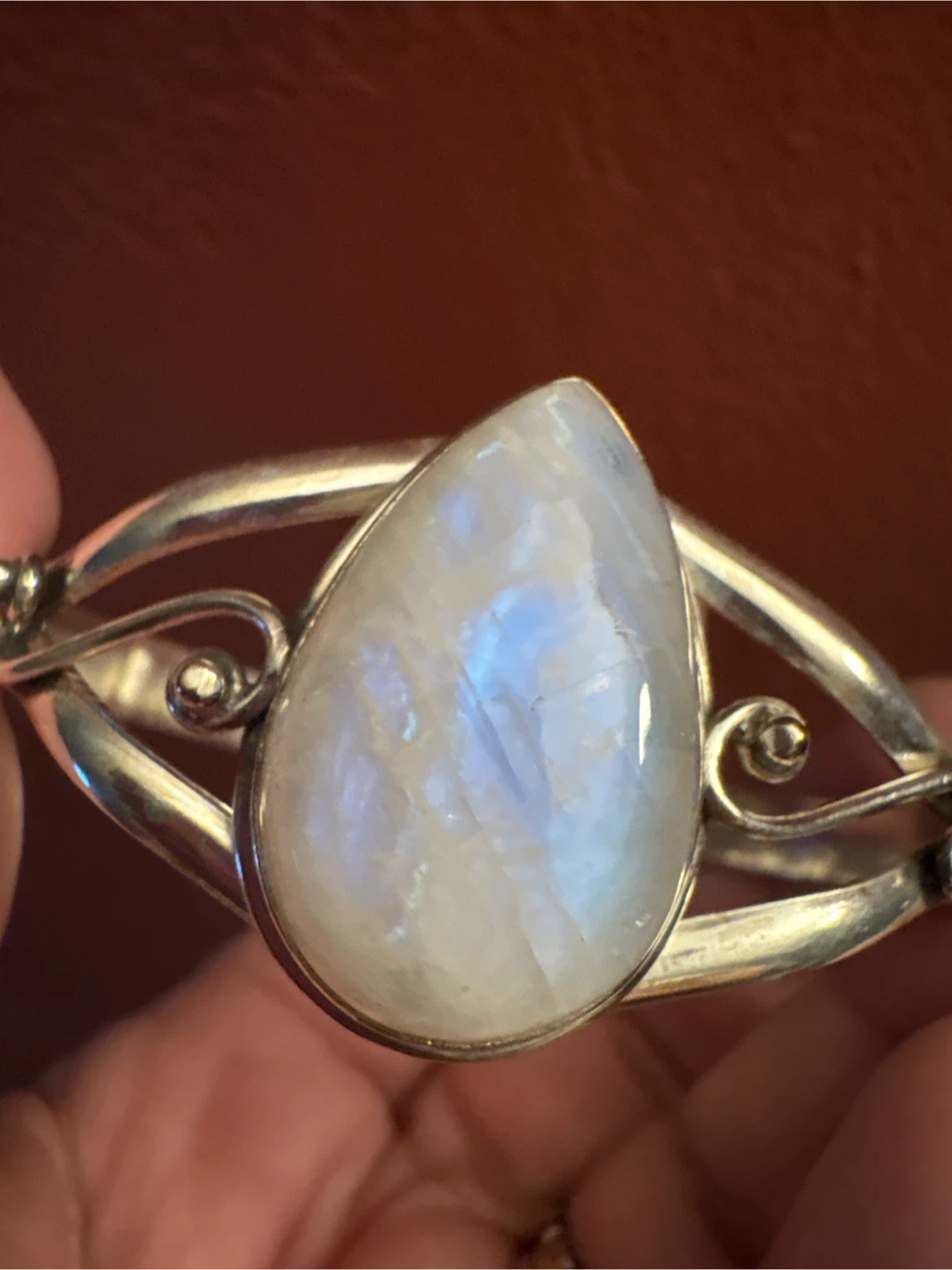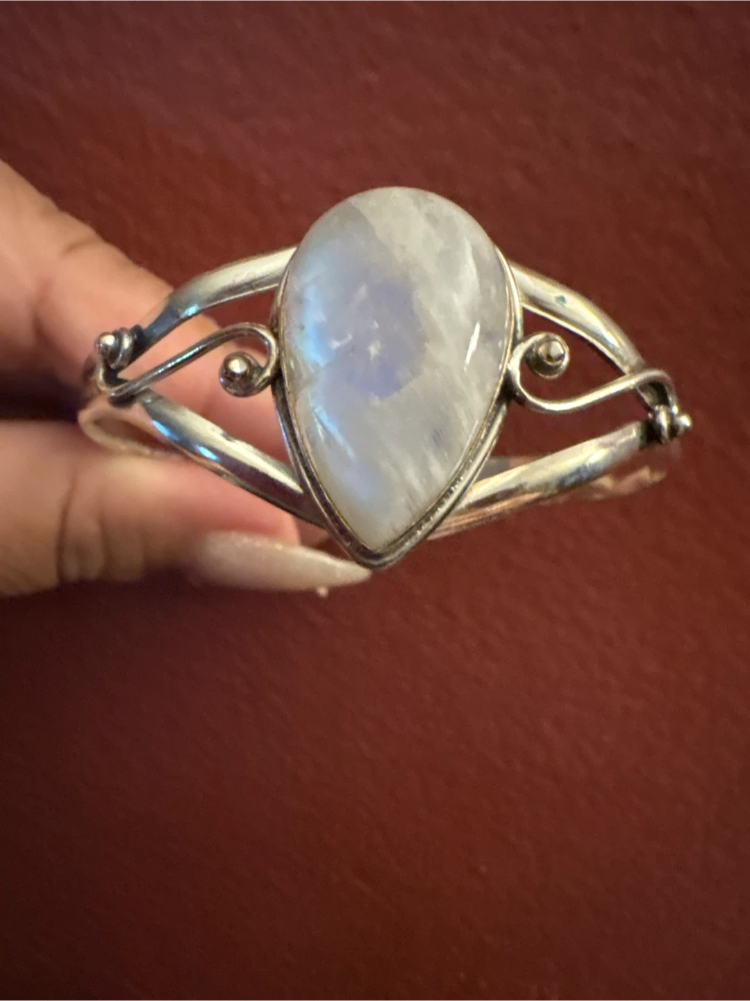 This cuff bracelet features a pear-shaped genuine moonstone set in β925 silver. It's stamped with '925' indicating sterling silver. This piece adds a unique touch to any jewelry collection.