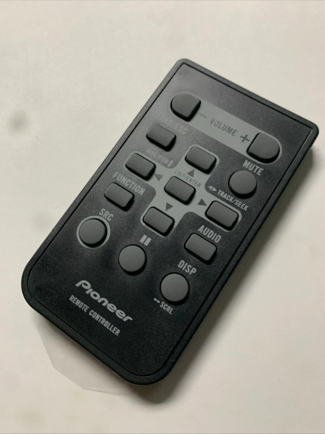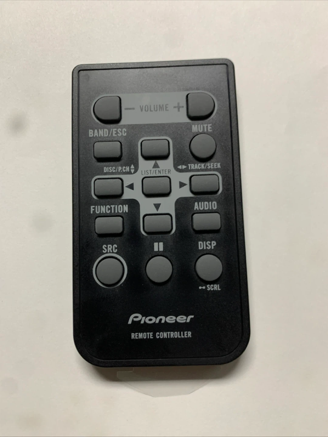 This is a Pioneer CXE9606 remote controller. It features buttons for volume, mute, track/seek, and audio functions. Includes buttons for band/esc, disc/p.ch, function, and source.