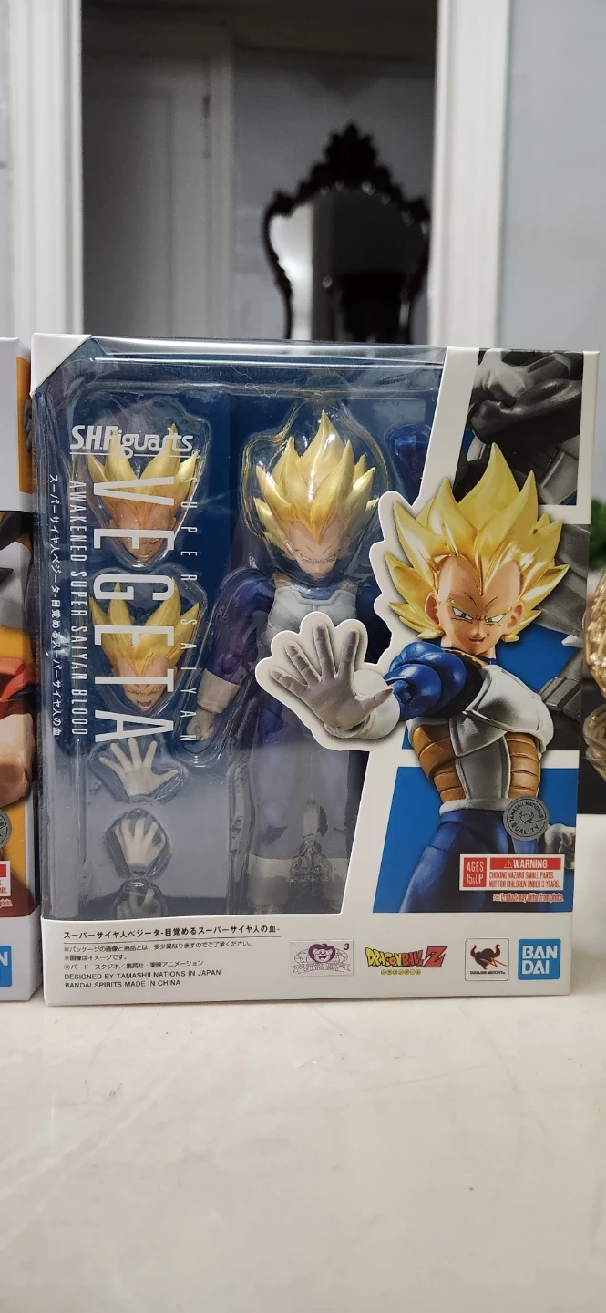 This is the SHFiguarts "Awakened Super Saiyan Blood" Vegeta action figure. It's designed by Tamashii Nations and made in China. The figure comes in its original packaging.
